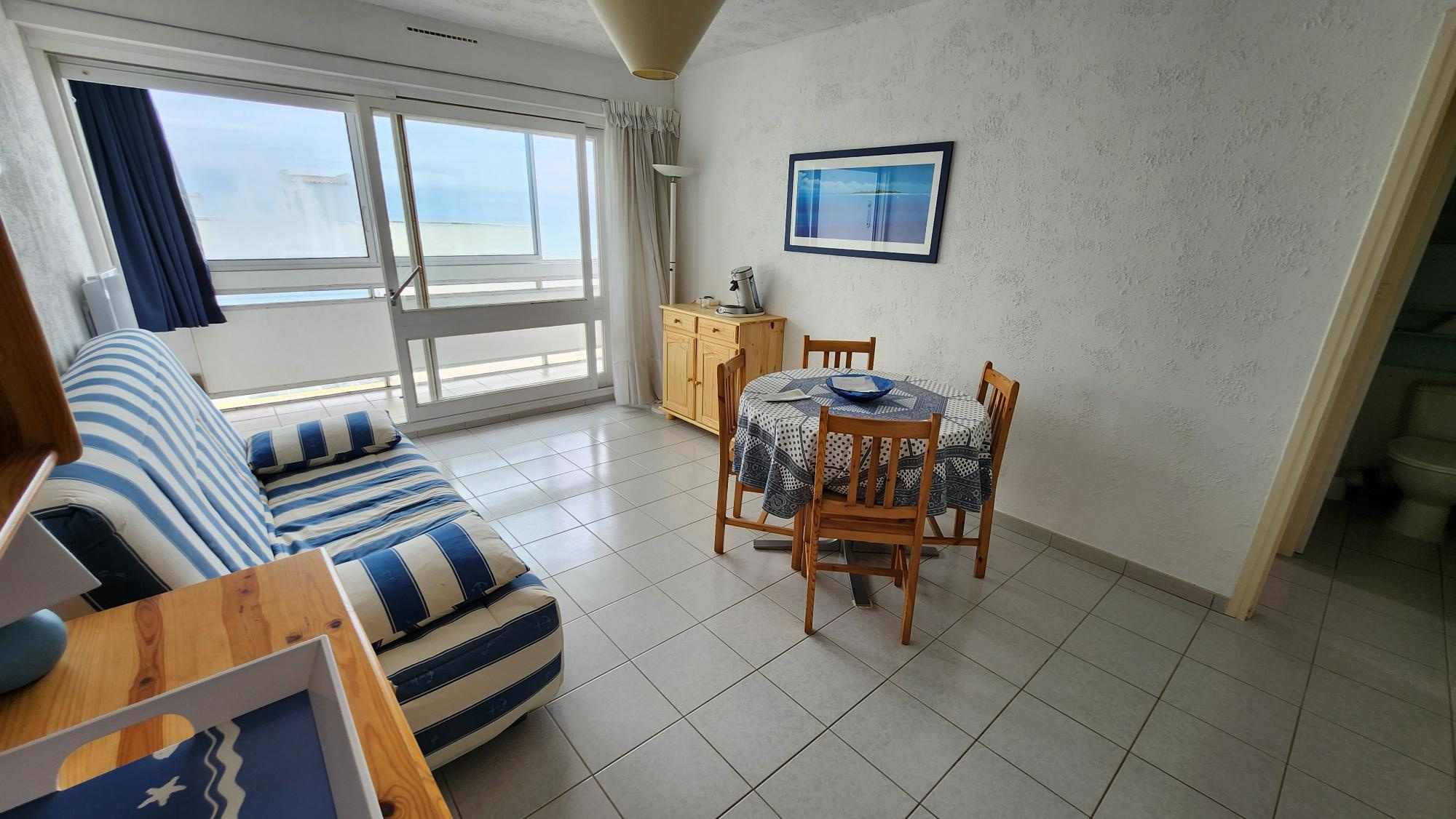 Vue mer et accès direct plage, pour cet appartement type 2 situé au 7 ème étage avec ascenseur, il offre 34 m2 de surface avec une chambre + 7 m2 de loggia. emplacement parking.