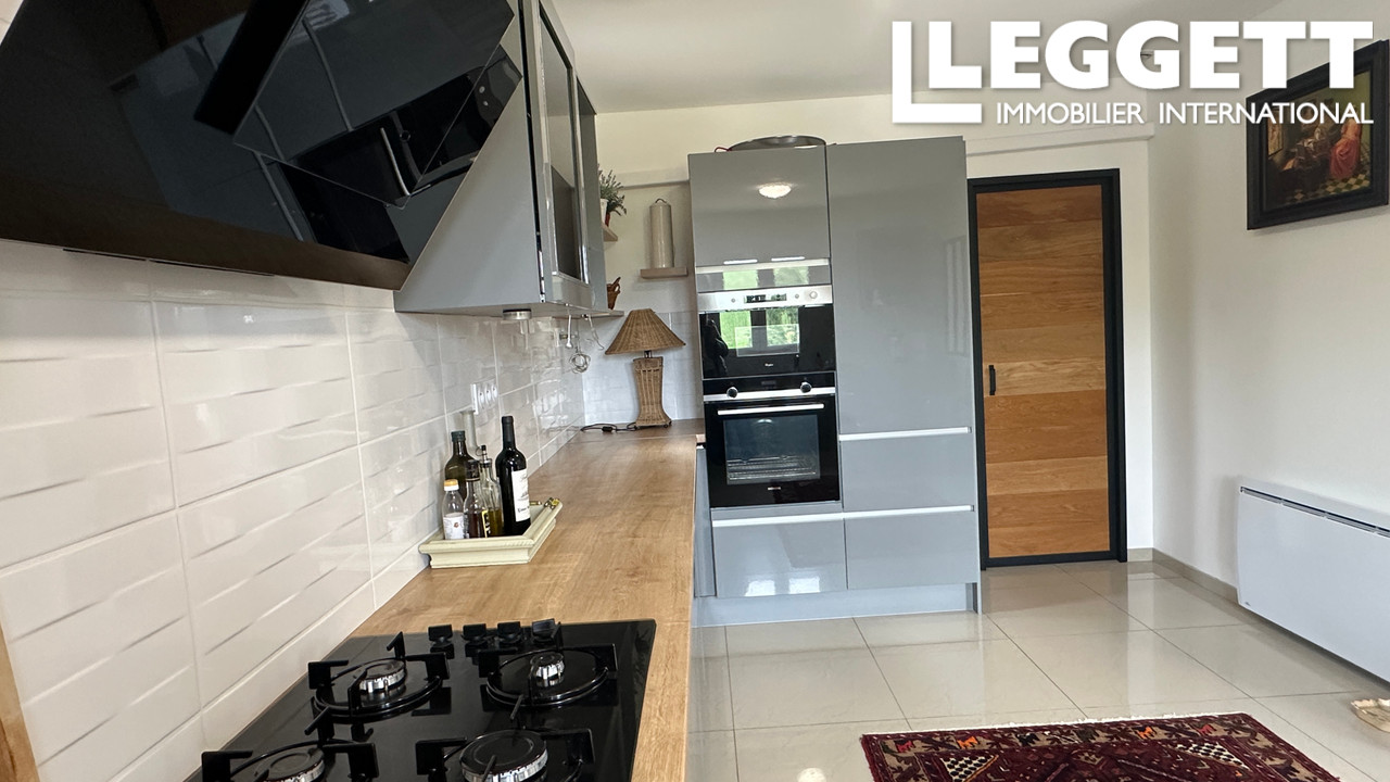 La cuisine est bien aménagée avec de nombreux rangements, lave-vaisselle et frigo intégrés, four, micro-ondes, plaque et hotte. Une porte coulissante vitrée permet de la séparer du salon.