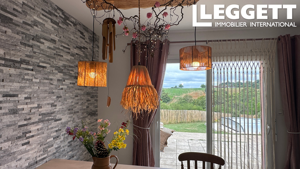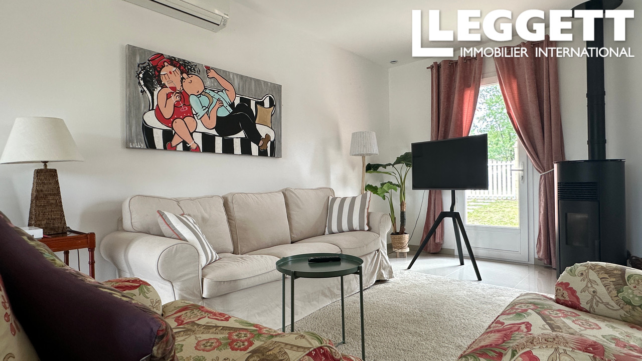 A30611SGE24 - À l'entrée, un salon lumineux vous accueille, avec un coin séjour équipé d'un poêle à pellets et d'une climatisation réversible, et une salle à manger ouvrant sur le jardin via des portes-fenêtres. La terrasse partiellement couverte offre une vue agréable sur la piscine au sel avec couverture rétractable.