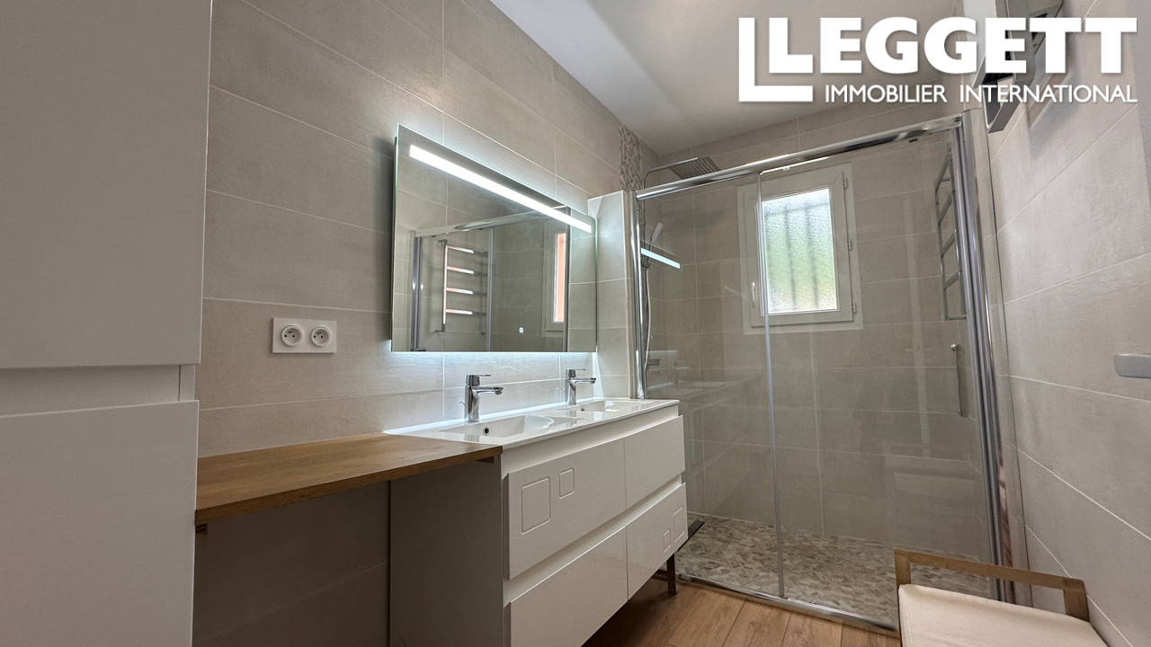 Le garage a été transformé en buanderie pratique. La salle d'eau moderne comprend une grande douche italienne, double vasque et WC séparés. Trois chambres avec placards intégrés complètent le plain-pied.