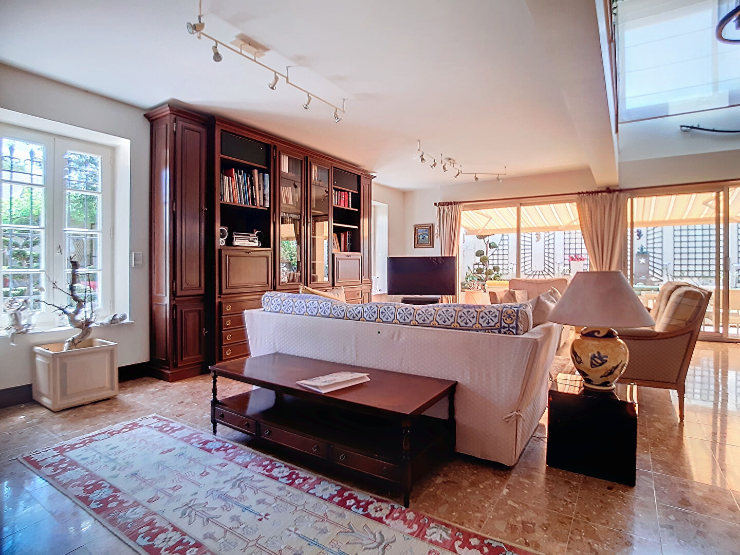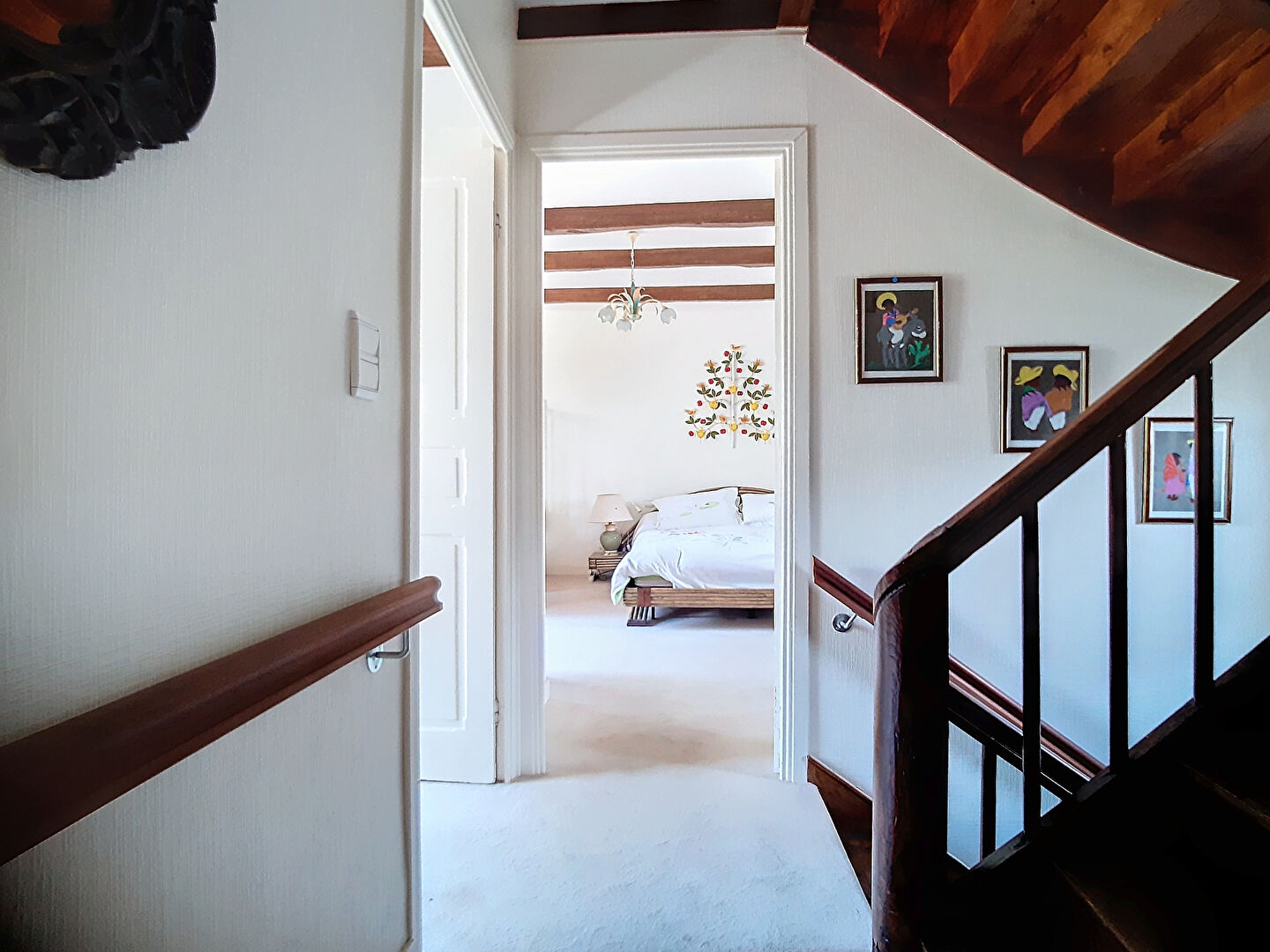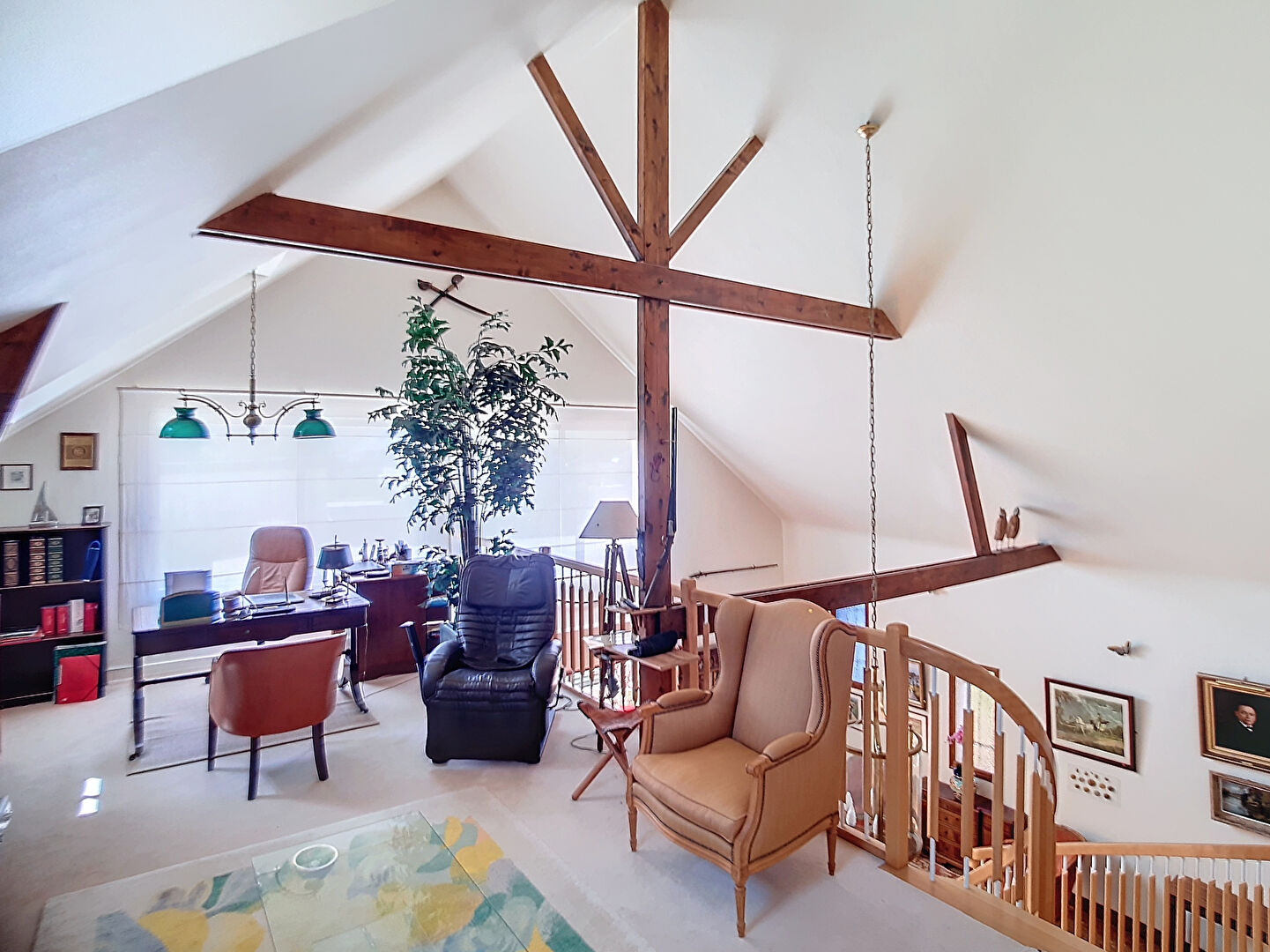 Un majestueux escalier courbe et sa volée de marches en éventail mène à une mezzanine qui surplombe le salon, ajoutant un charme indéniable à l'ensemble. Une porte mène à une suite parentale, comprenant une chambre lumineuse, un salon privatif, une salle de bain avec douche, baignoire, bidet et WC, ainsi qu'un dressing.