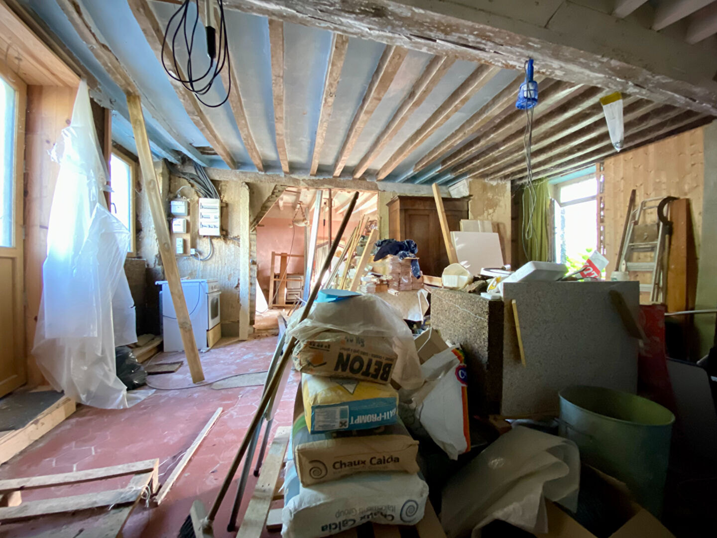- une pièce à rénover d'environ 49 m² avec un poêle de masse