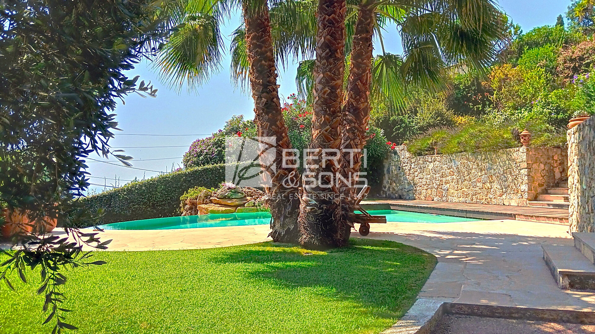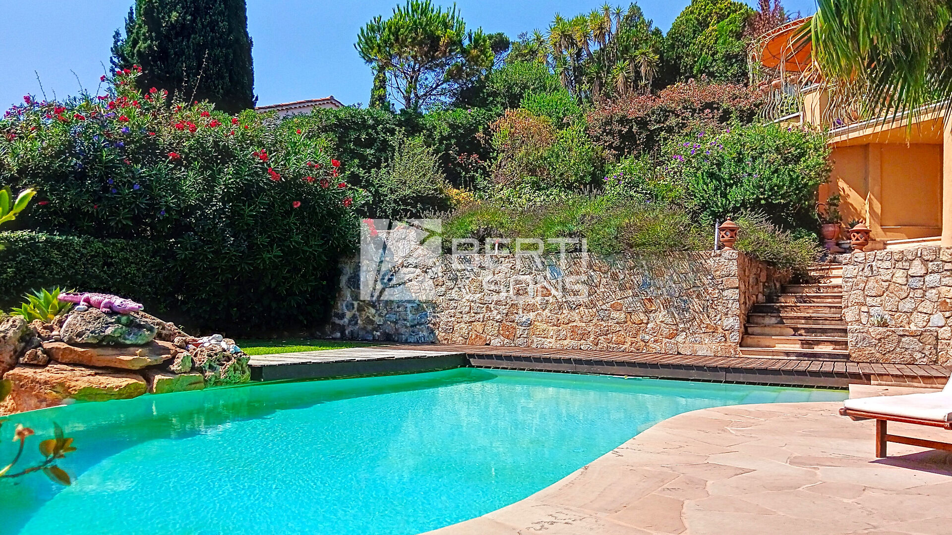 - d'un appartement d'appoint de deux pièces ouvrant sur une ravissante terrasse et donnant accès à la superbe piscine de forme libre, sécurisée par un volet électrique, avec plage en teck, chauffée, au sel, avec jets, remous et cascade.