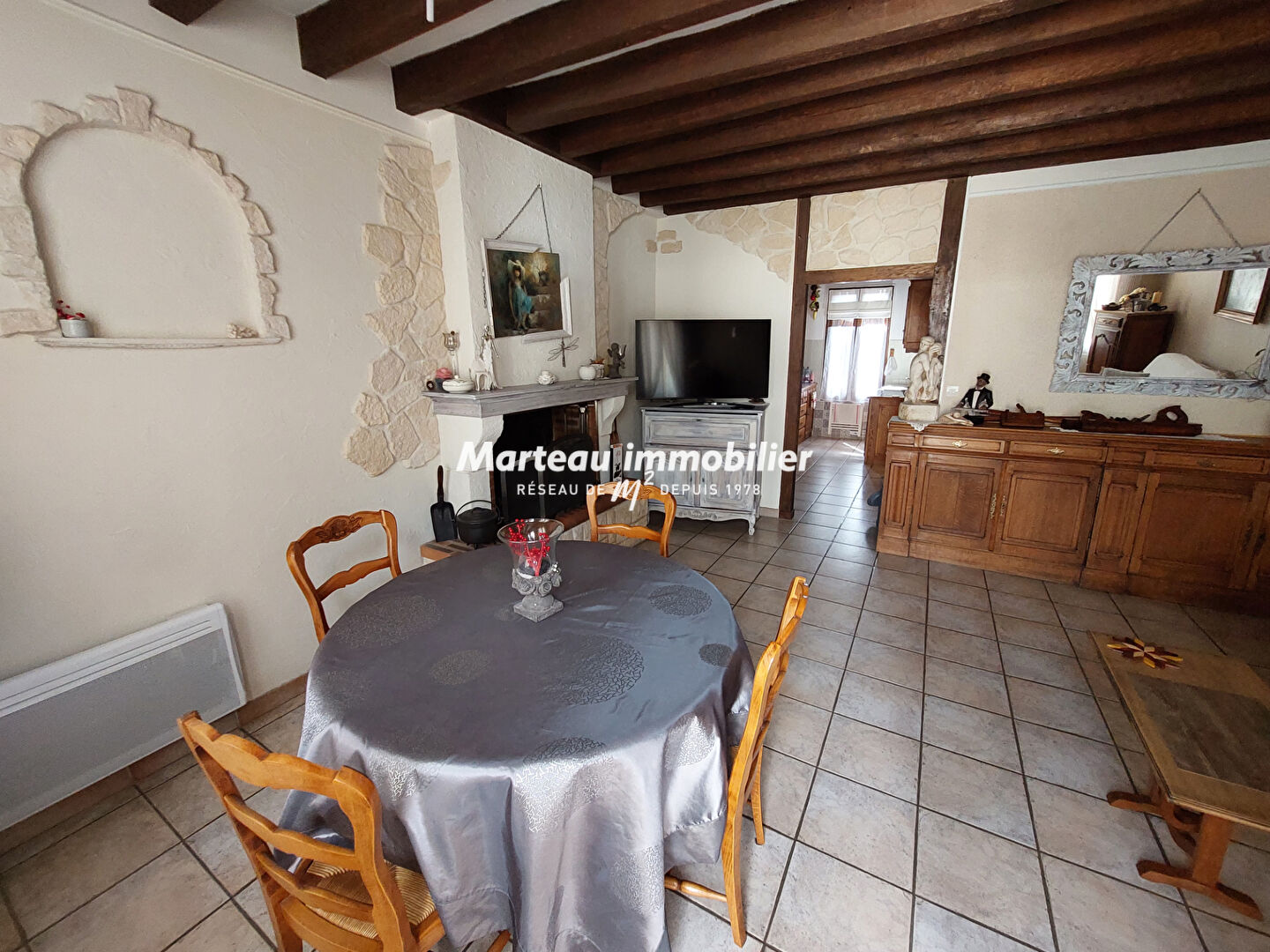 Maison de bourg en parfait état avec poutres apparentes comprenant au rez de chaussée 1 cuisine aménagée et équipée, un salon/séjour avec belle cheminée, une salle de bain, une véranda carrelée avec accès direct à 1 cave voutée. A l'étage 2 belles chambres, salle d'eau.