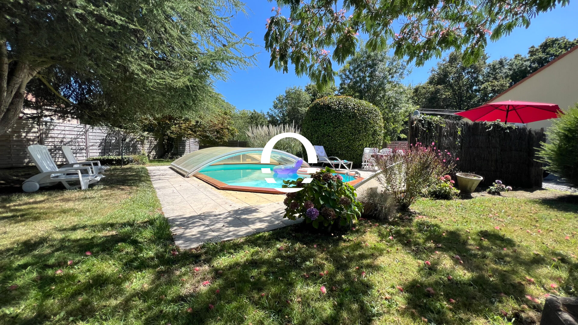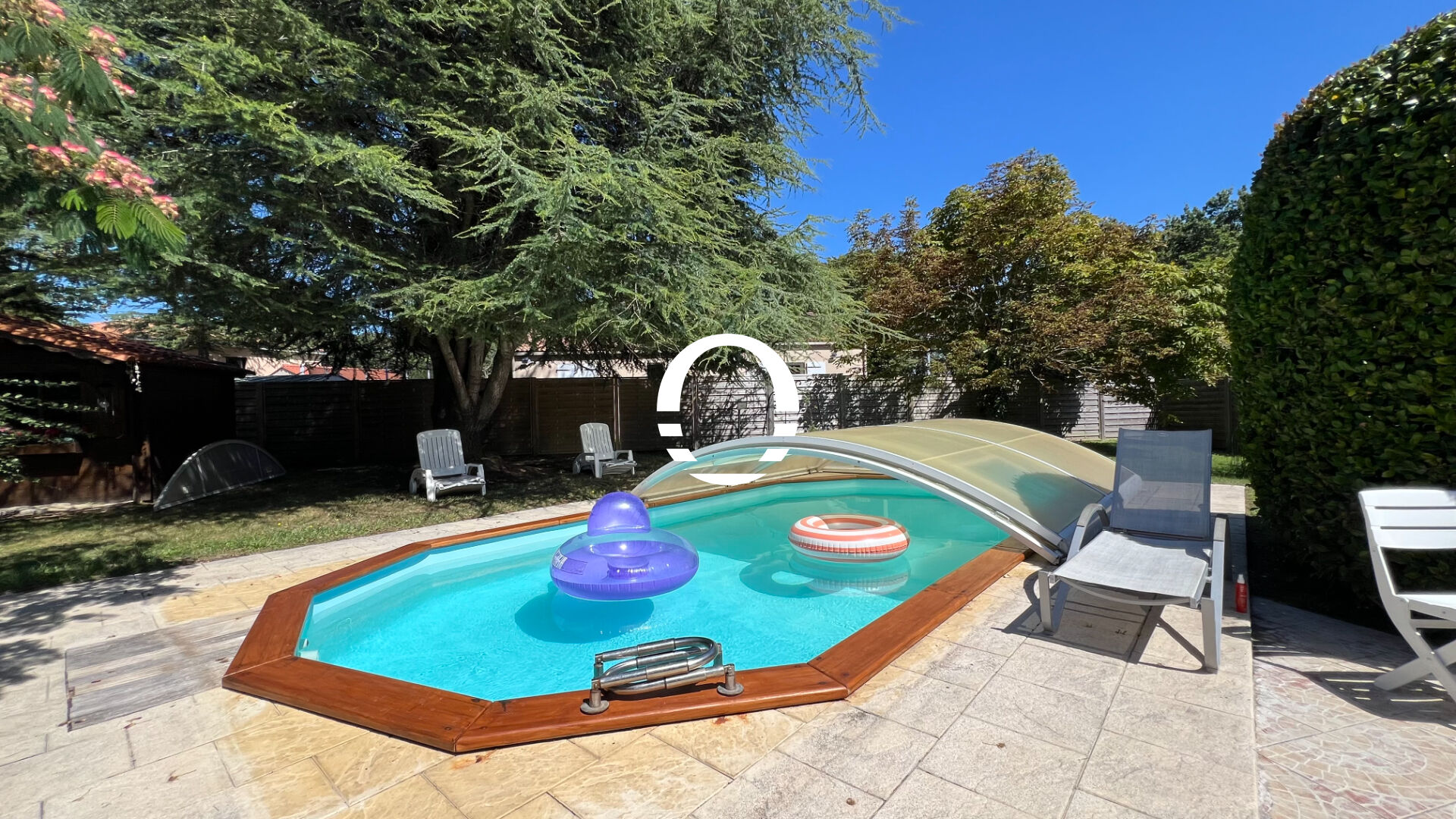 Jardin clos, garage, piscine en bois couverte et démontable, abri de jardin et puits à usage d'arrosage avec surpresseur.