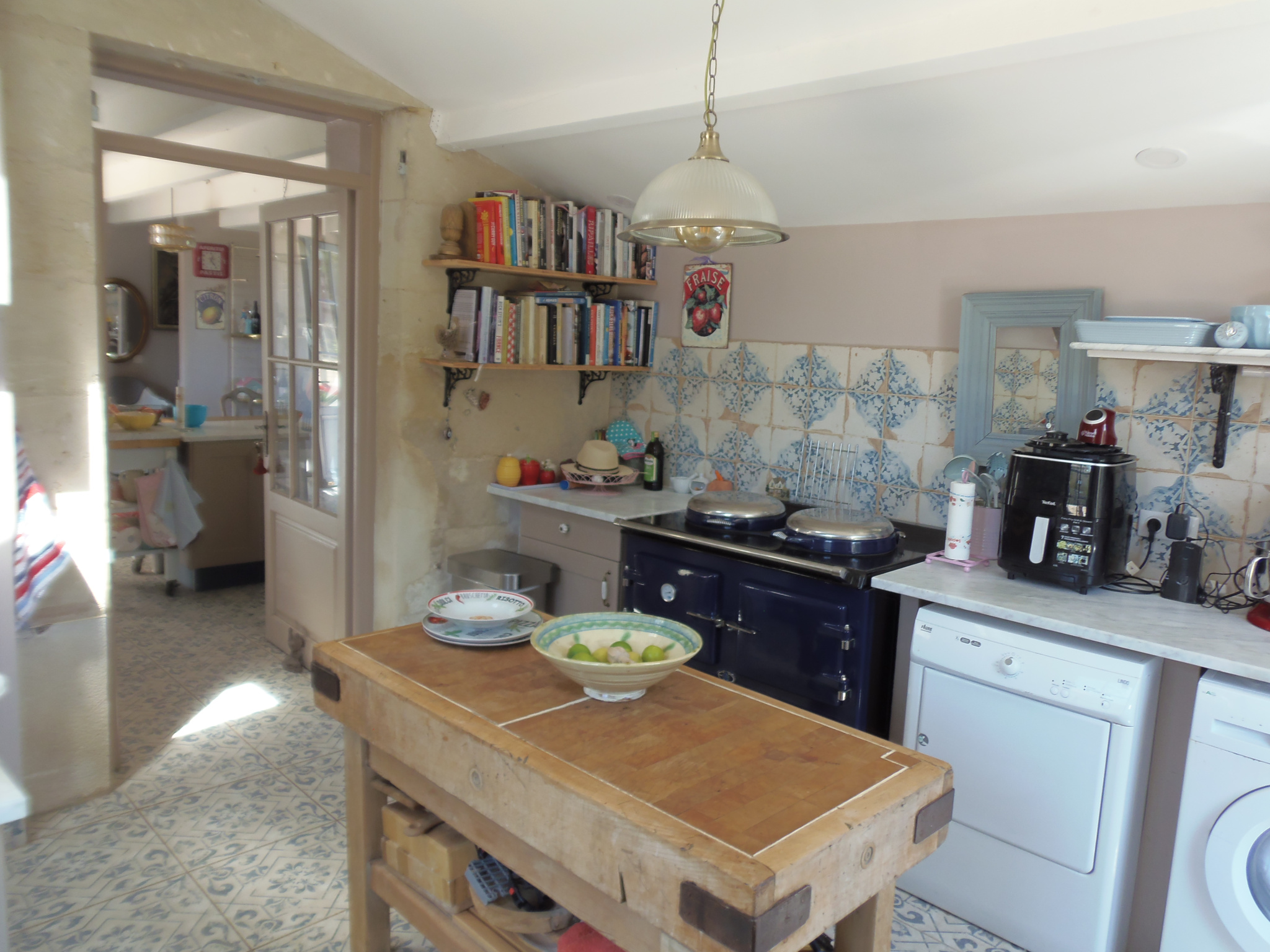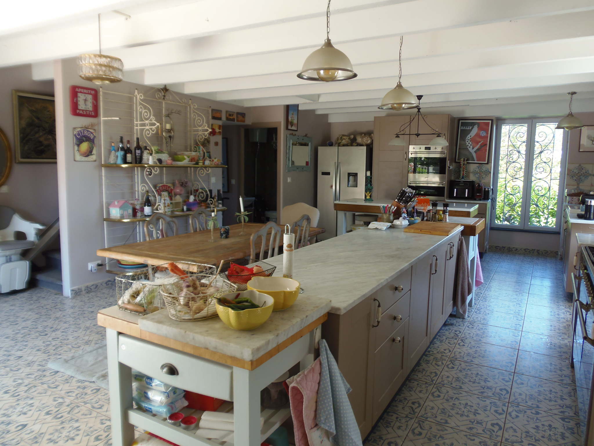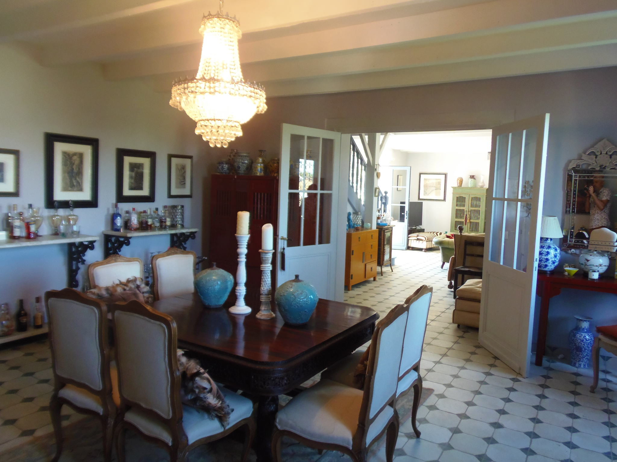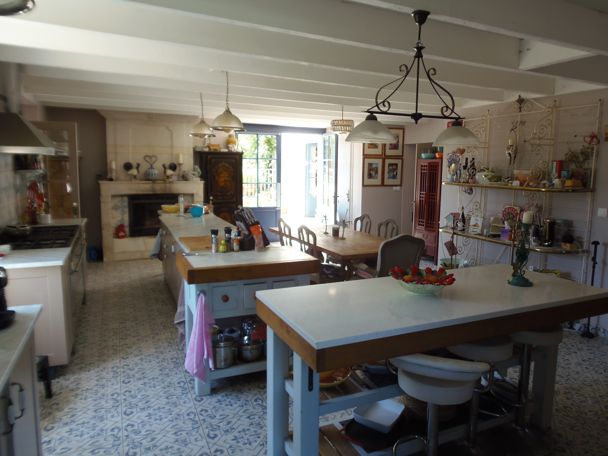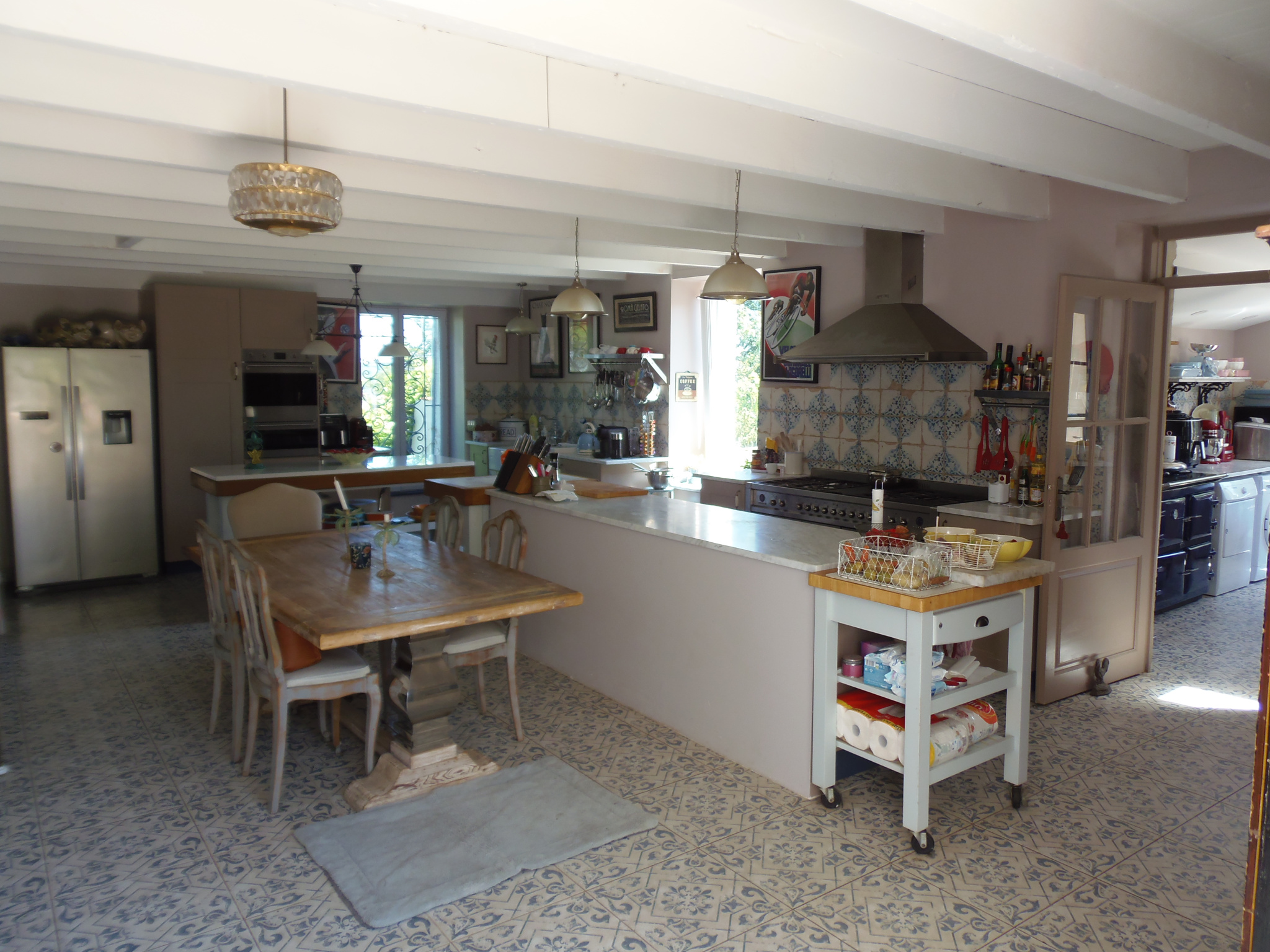 La sublime cuisine de 45m2 avec un four de 1 mètre et demi de large, des plans de travail en marbre de Carrare, une cheminée en pierre et des portes-fenêtres donnant sur la terrasse et la piscine chauffée d'eau salée. Une buanderie/arrière-cuisine de 14m2, une salle à manger de 31,5m2 et un salon lumineux de 46,5m2 avec une cheminée en pierre et un poêle à bois et des portes-fenêtres donnant sur la terrasse et la piscine.