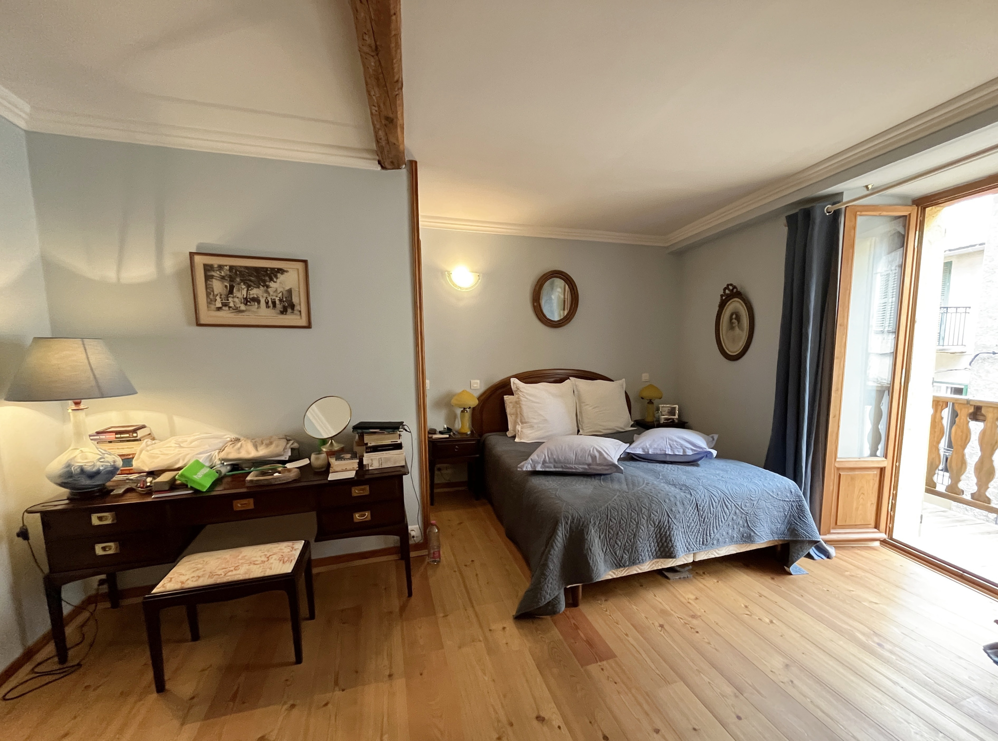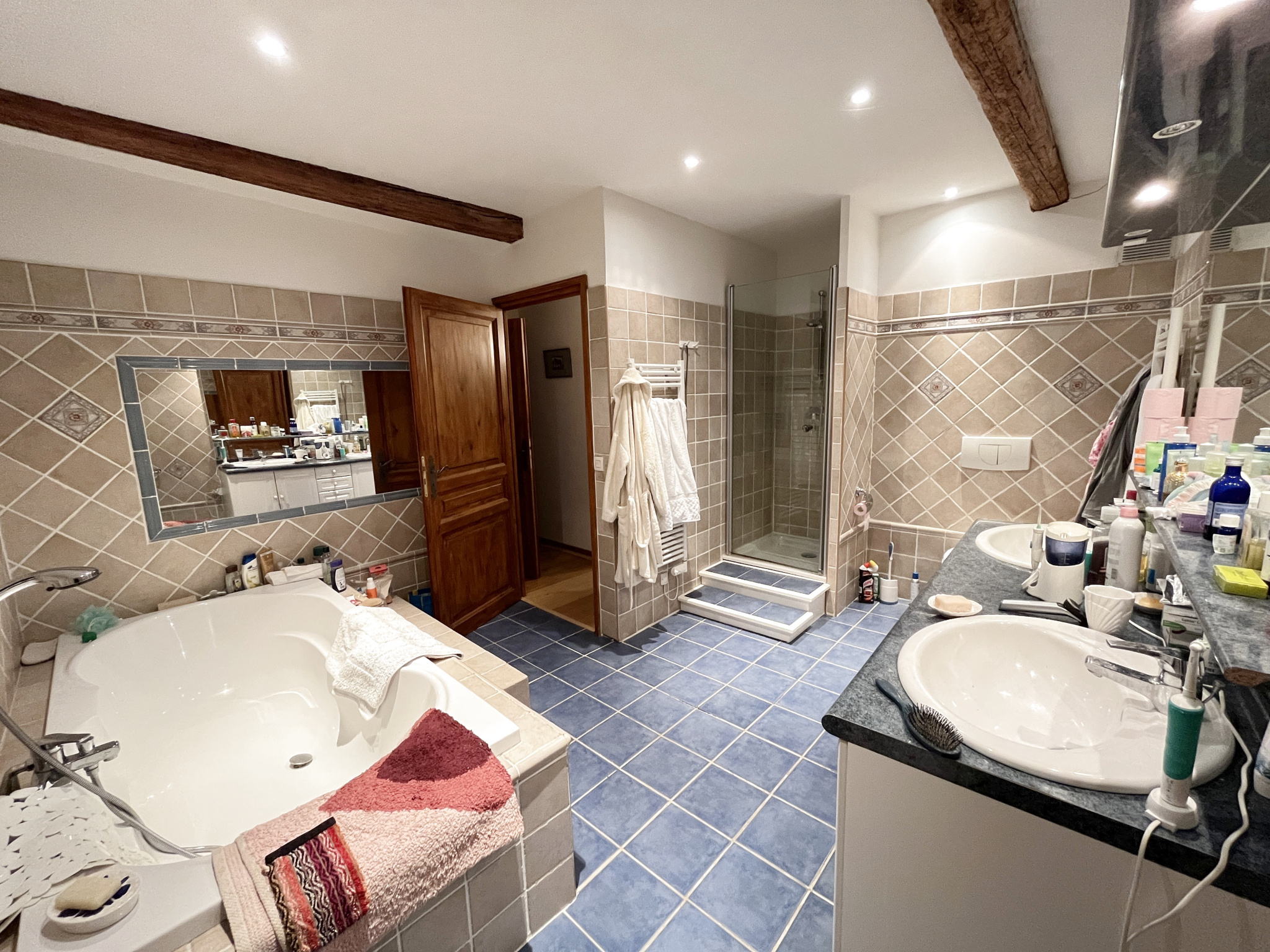 - Au 2ème étage : un couloir de distribution, une chambre donnant sur balcon avec 2 placards et une salle de bain (baignoire, douche, wc, bidet, double vasque)