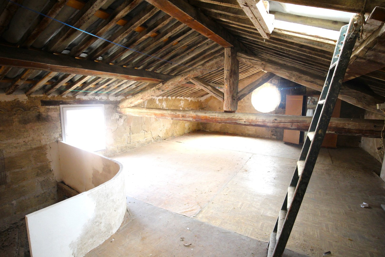 Au-dessus, le grenier est accessible par un escalier.
