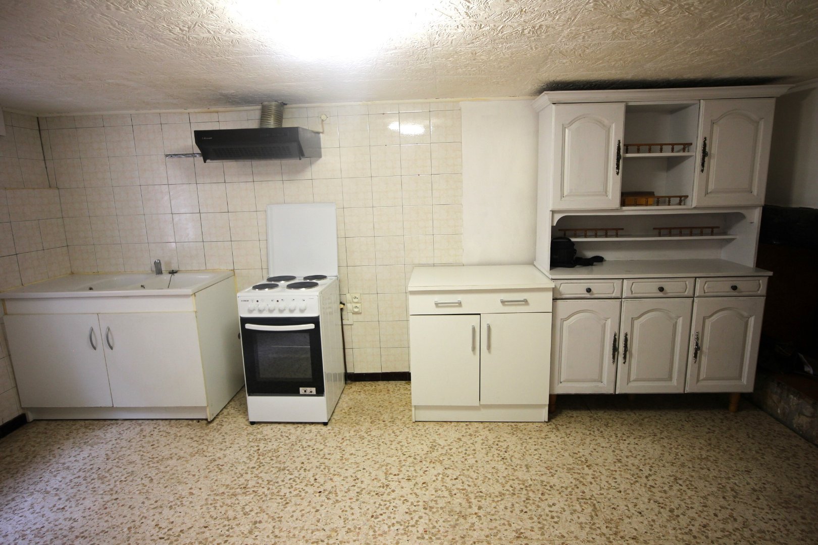 Au premier étage, la cuisine et le salon (avec une superbe cheminée en pierre) sont combinés. La cuisine est fonctionnelle, avec un petit coin repas. La salle de bains et les toilettes se trouvent à cet étage.