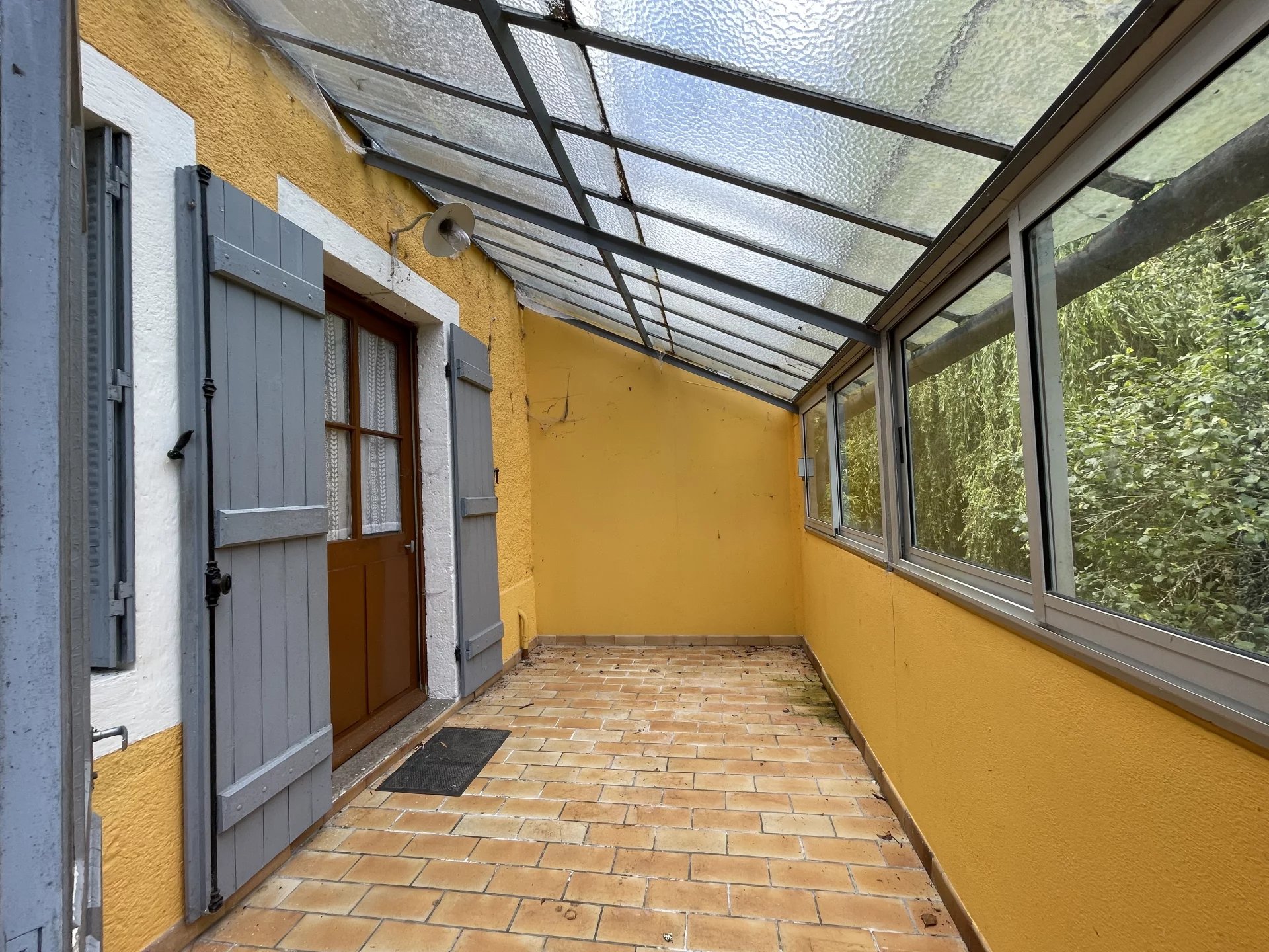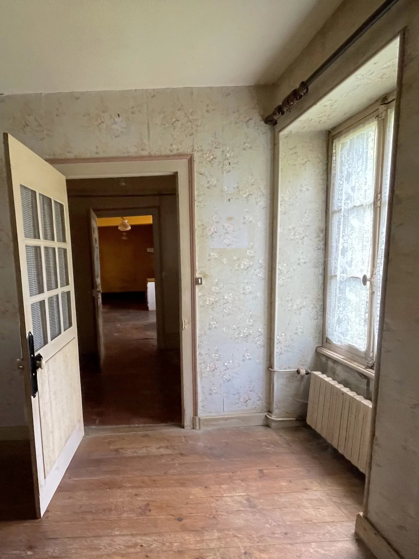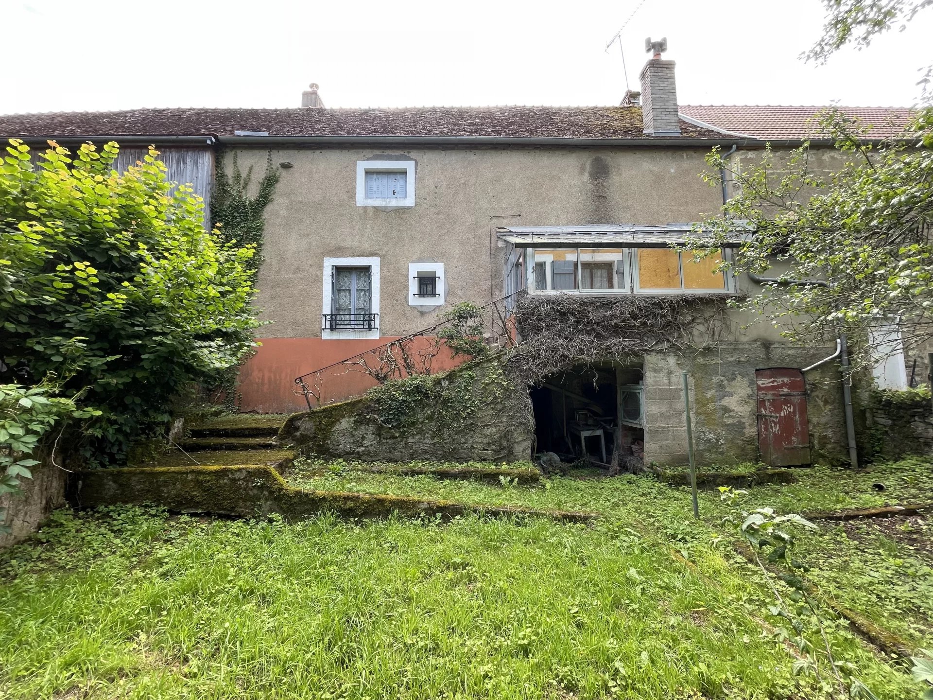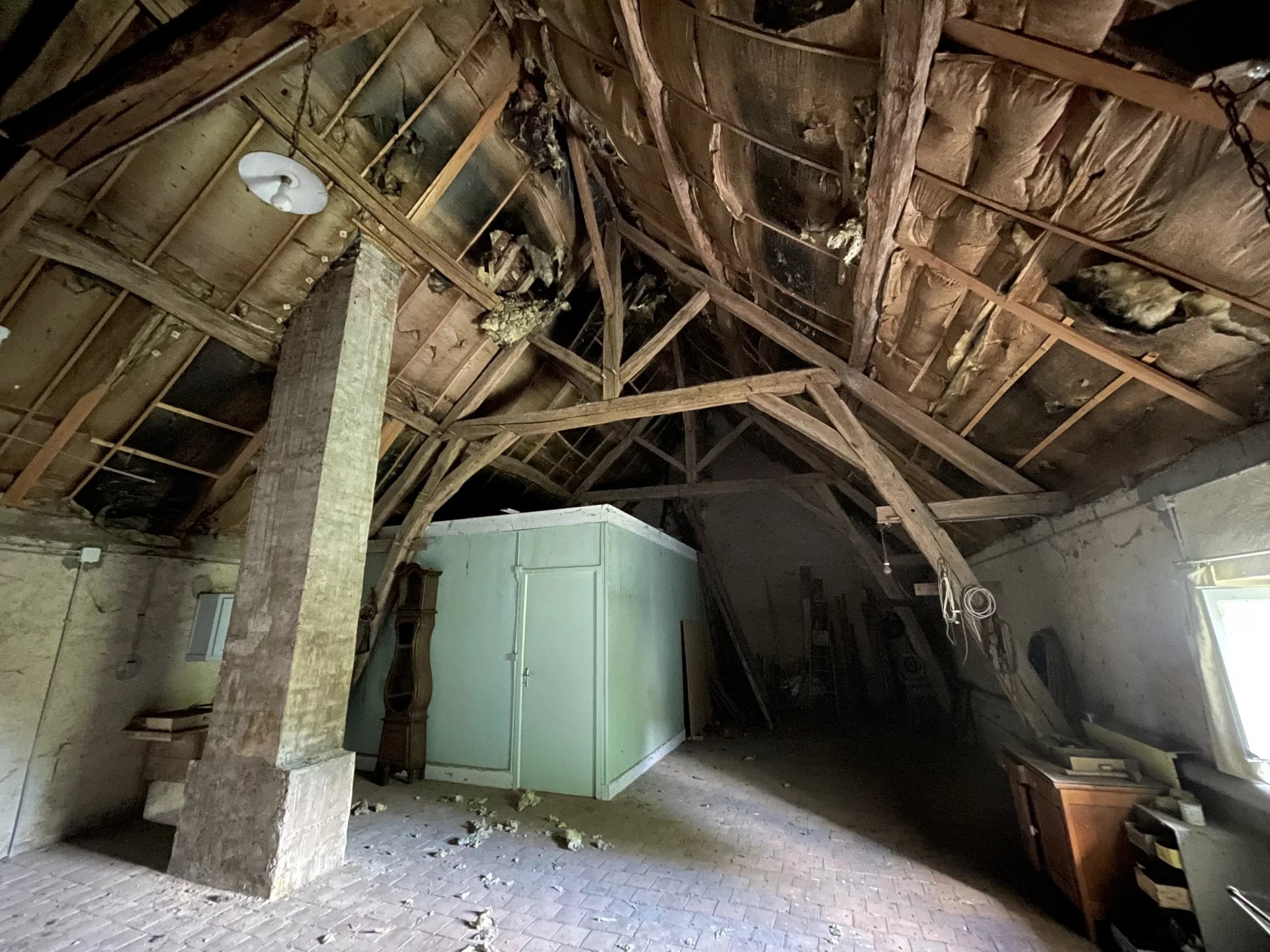 À l’étage (2d appartement possible) : accès séparé par la seconde entrée. Un joli escalier en bon état mène à l’étage, où l’on retrouve un sol en tomettes bien conservé. Vous avez la possibilité d’un aménagement libre sous combles grâce à une hauteur sous plafond de 2.50 m, avec une première chambre déjà existante. La charpente est en bon état. Pour la détente, vous pouvez profiter du jardin devant la maison.