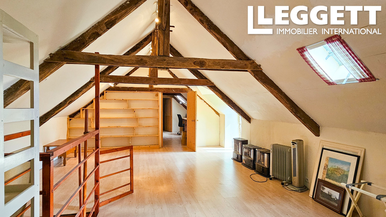 Séjour avec cheminée, cuisine équipée, quatre chambres, deux salles de bains, W.C., trois pièces mansardées, grand atelier, écurie, coin cuisine extérieur, et deux terrasses.