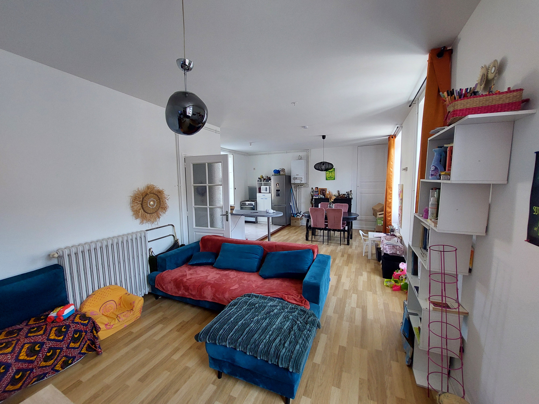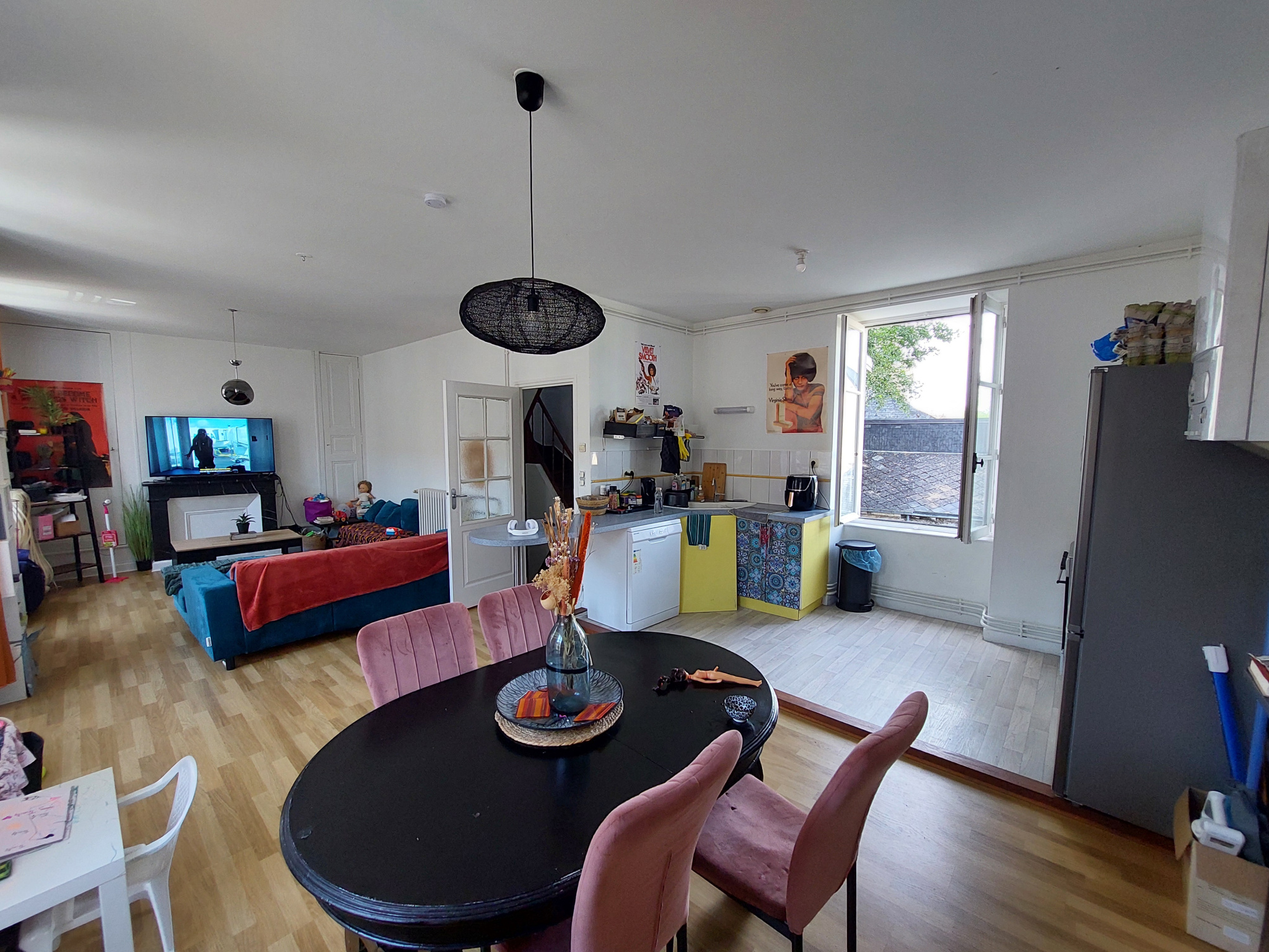 Au 1er étage en duplex, appartement comprenant : une pièce de vie avec coin cuisine, une suite parentale avec salle d'eau, WC séparé. A l'étage, 2 chambres et une salle d'eau avec WC. Loué 565.57EUR + 22.93EUR de charges par mois.