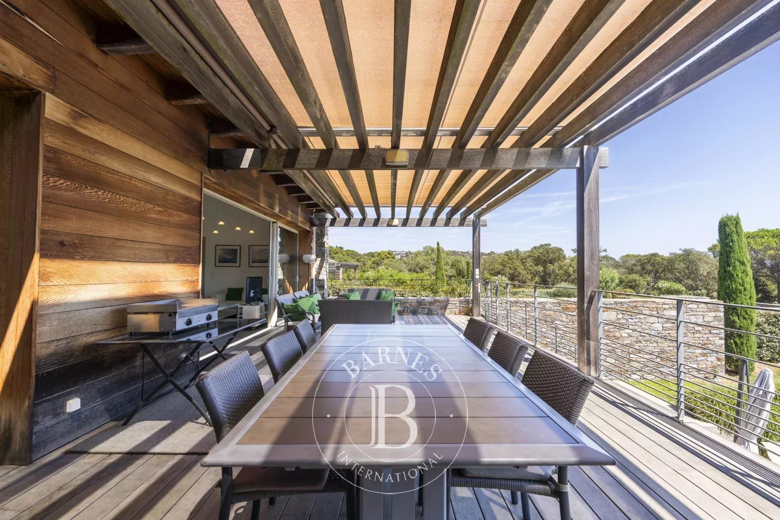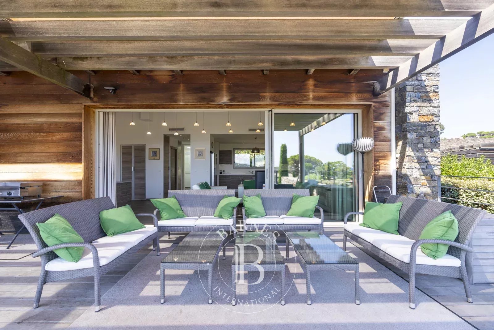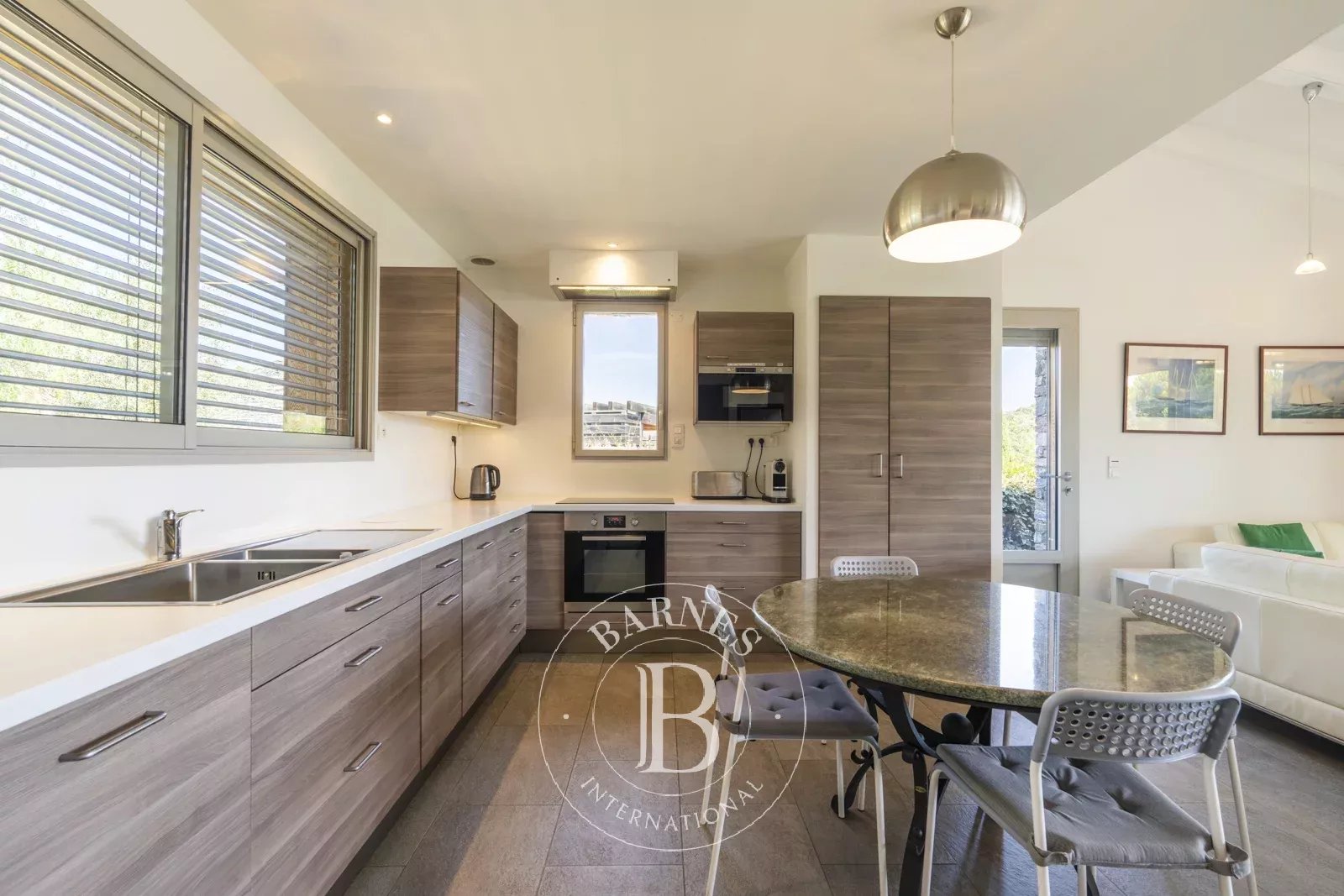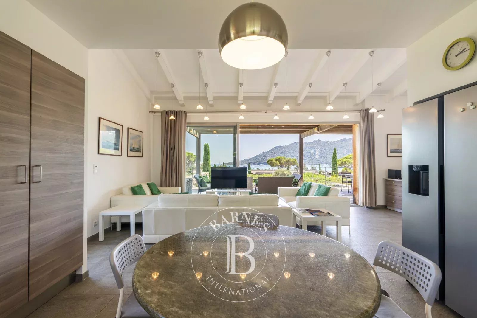 La villa d’environ 143 m² propose un espace de vie lumineux avec salon et salle à manger ouverts sur une large terrasse dominant la baie, ainsi qu’une cuisine américaine et une buanderie.