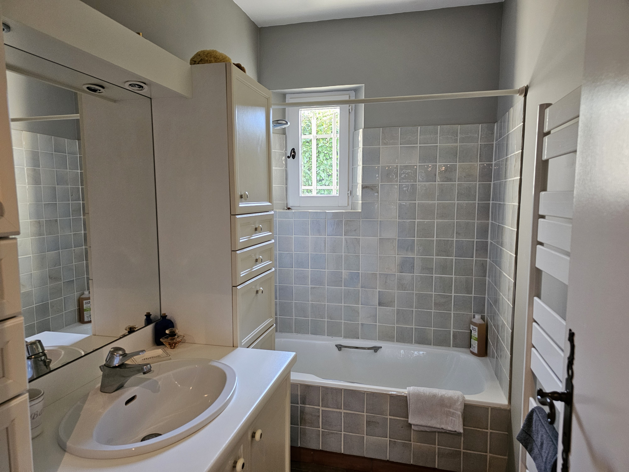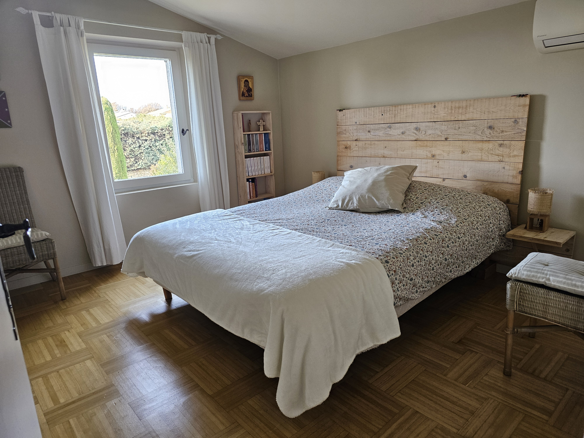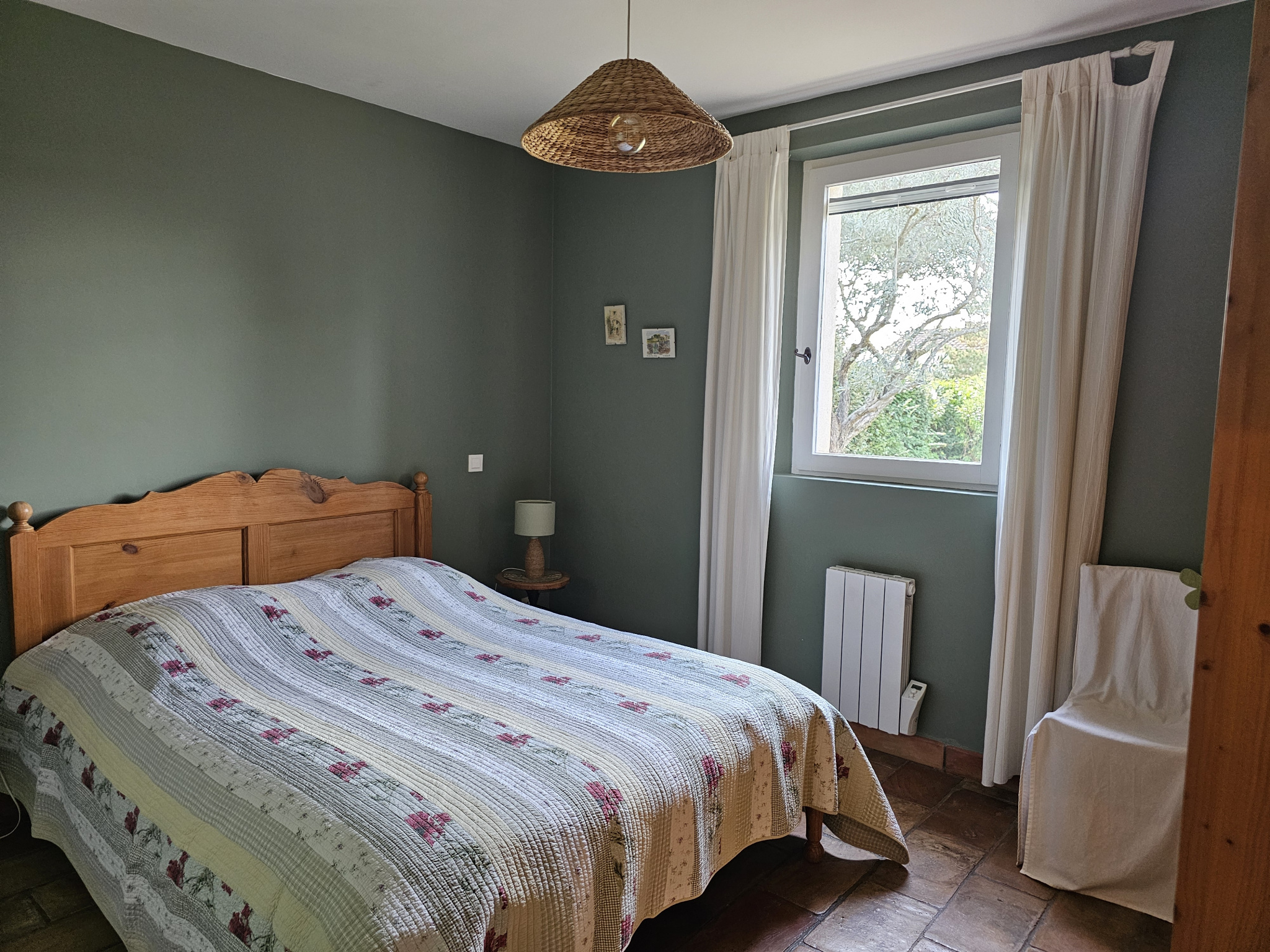 A l'étage un escalier avec un garde-corps en fer forgé nous mène à deux chambres avec placard, dont une équipée d'une clim réversible, une salle de bains, et des wc indépendants.
