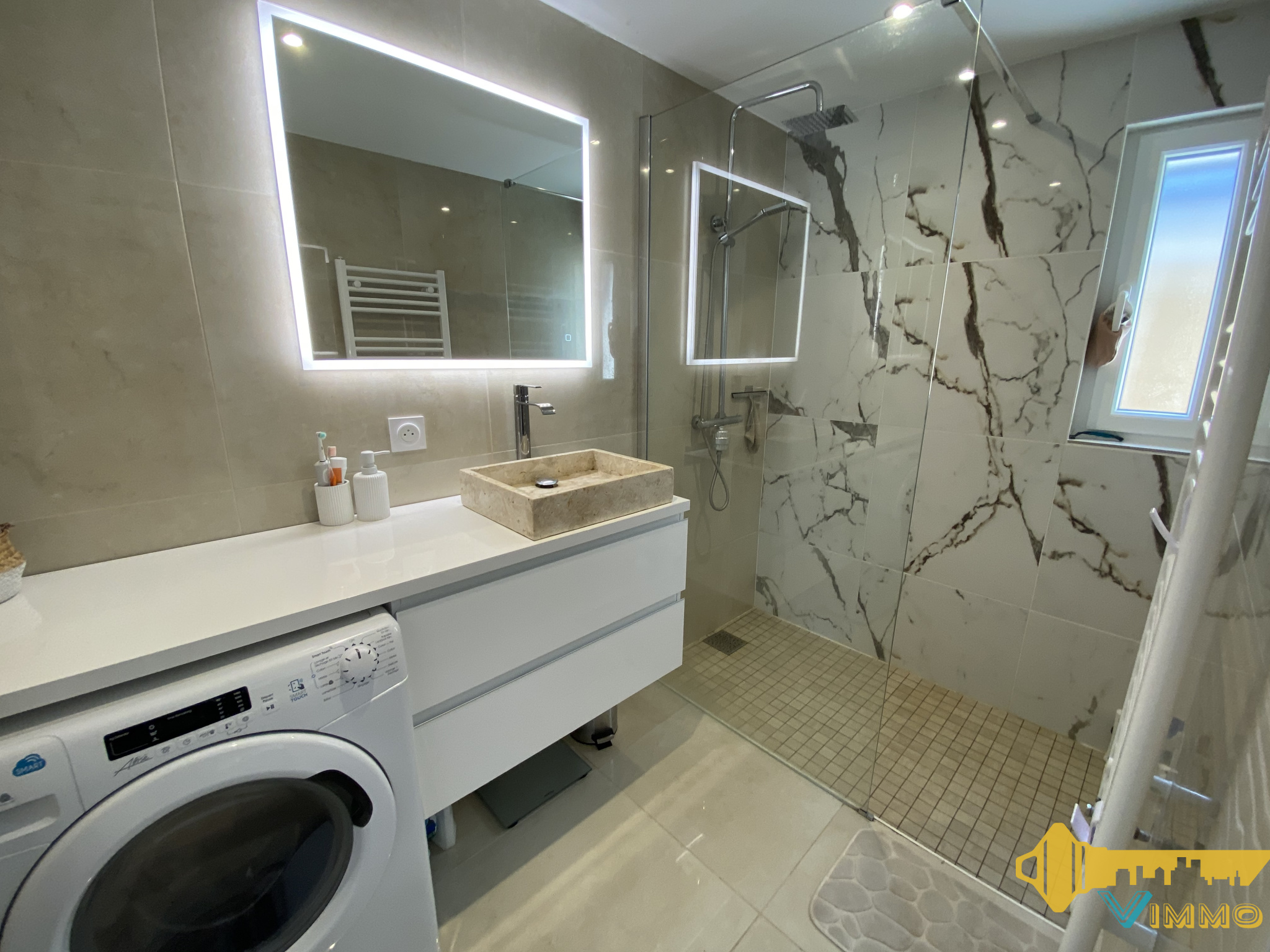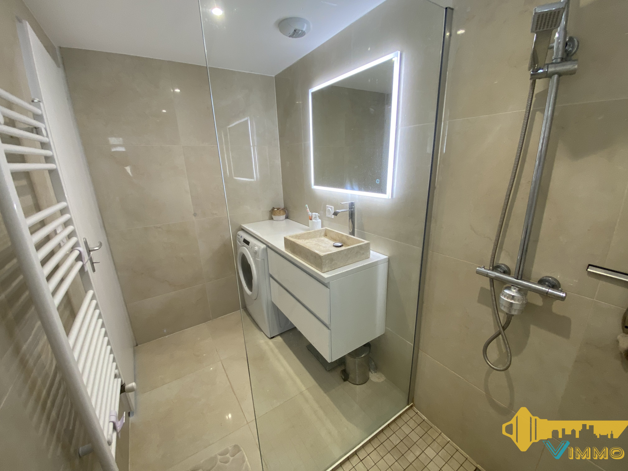 > 2 chambres (12,45m2 et 18,40m2) dont la plus grande avec un espace dressing aménagé, une salle d'eau (douche italienne, 1 vasque-rangements, sèche-serviettes) (3,70m2) et un W.C indépendant (1,17m2).