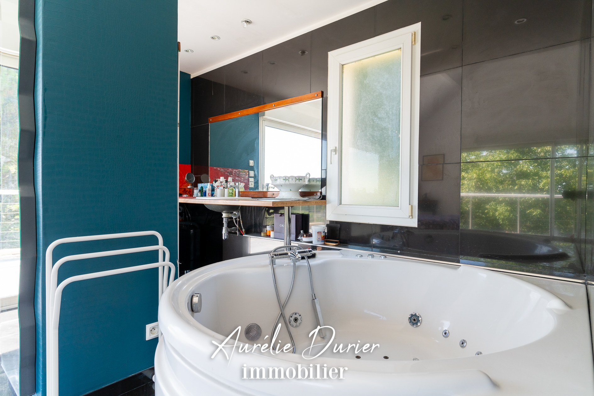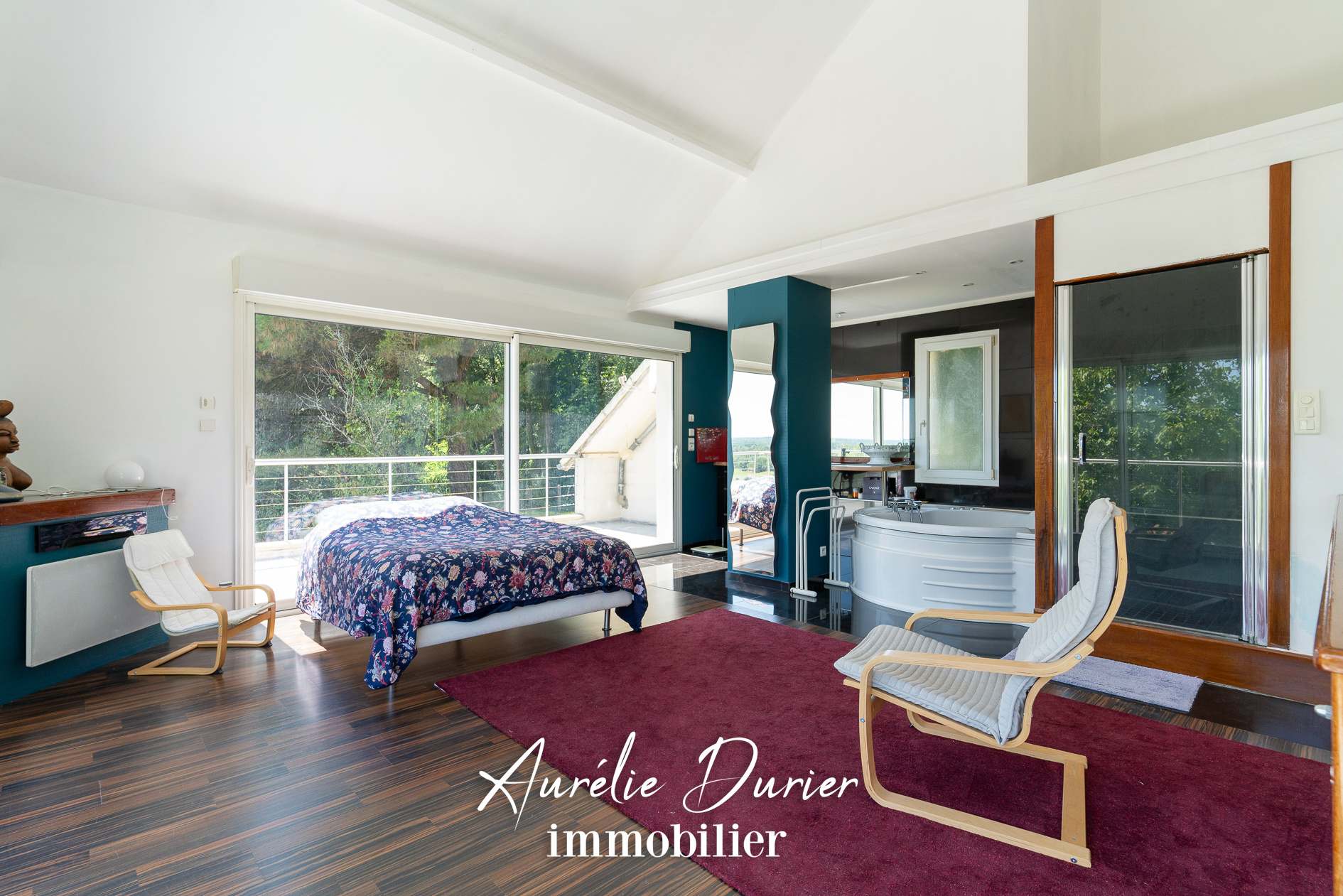 À l'étage, la suite parentale offre un havre de paix luxueux sur la nature et dispose d'une salle de bains avec douche, baignoire et d'un dressing.