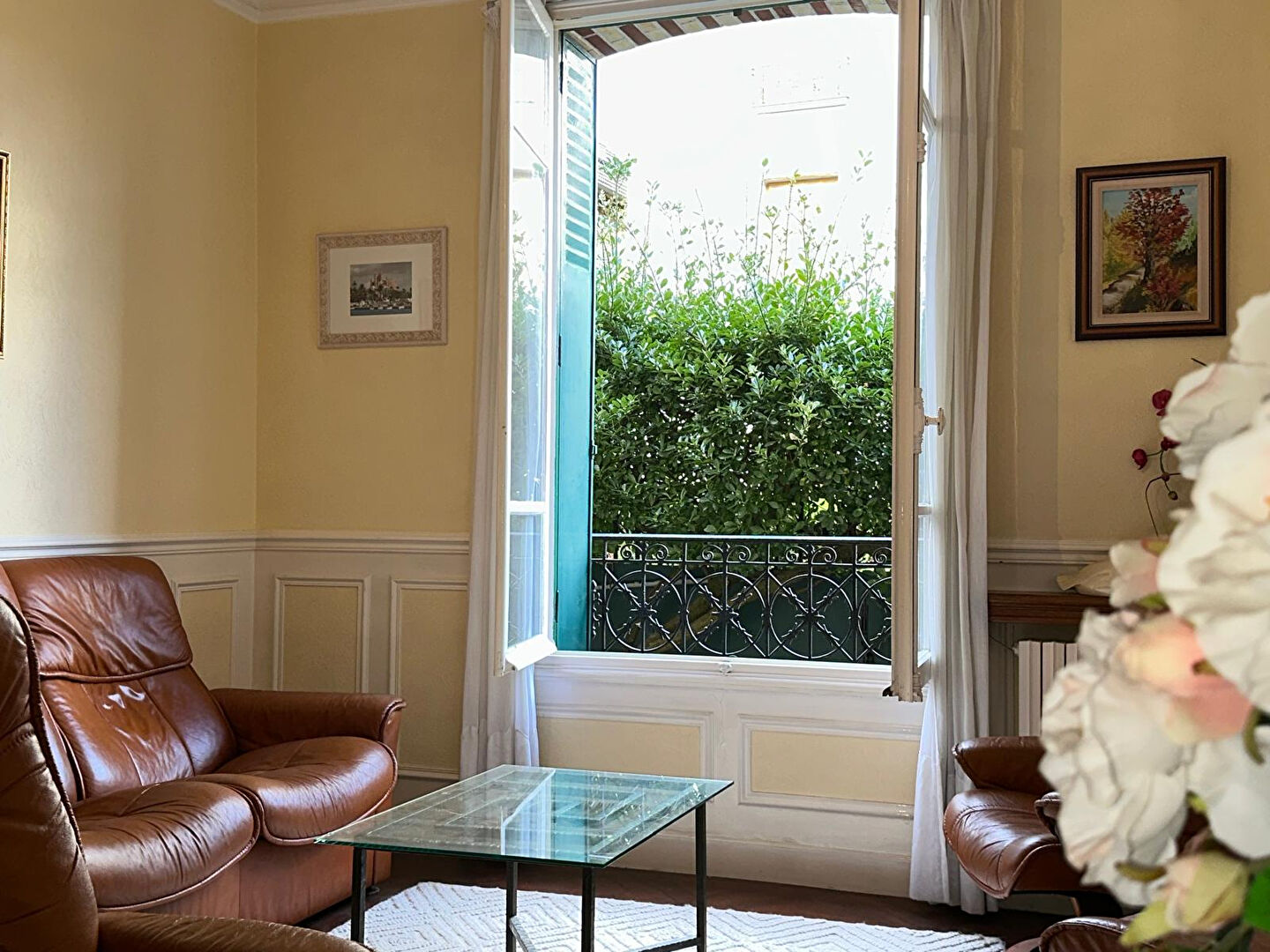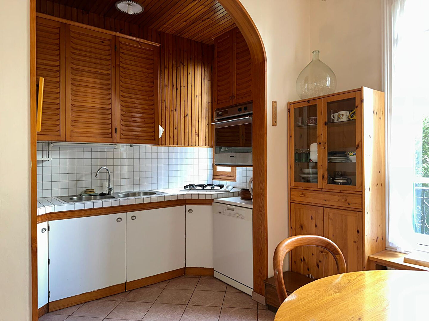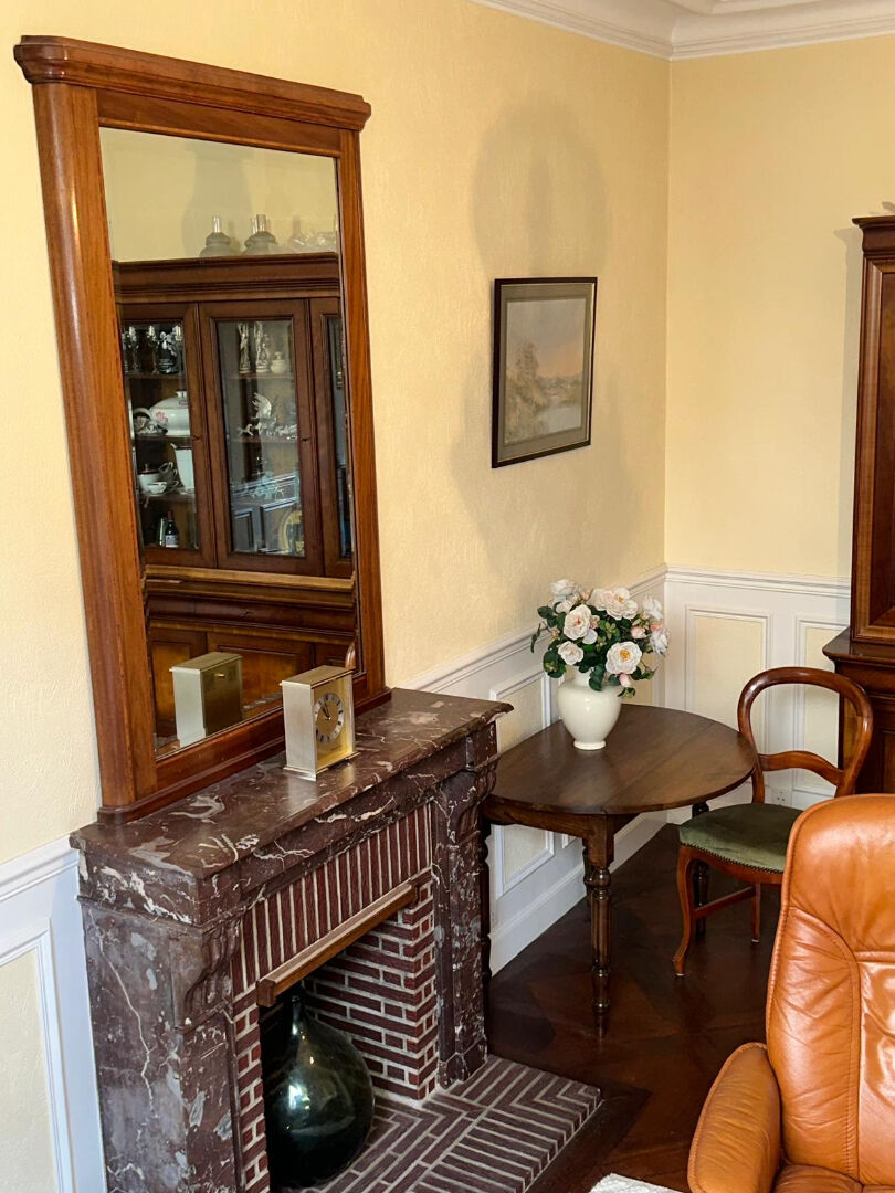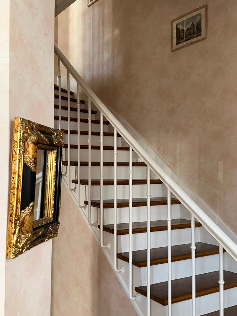 Au rez-de-chaussée, l'entrée dessert une cuisine avec espace repas, puis un séjour lumineux, agrémenté d'une cheminée en marbre. L'escalier en bois d'origine relie les différents niveaux.