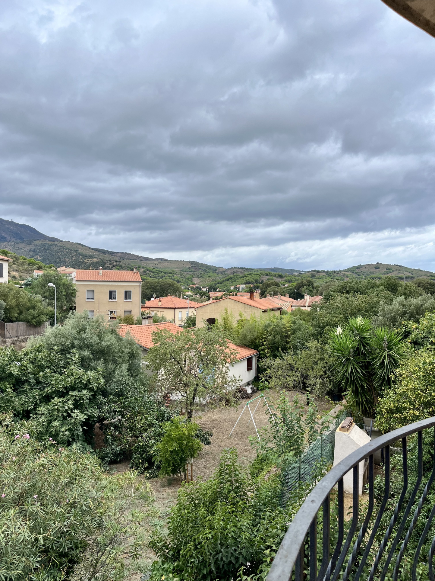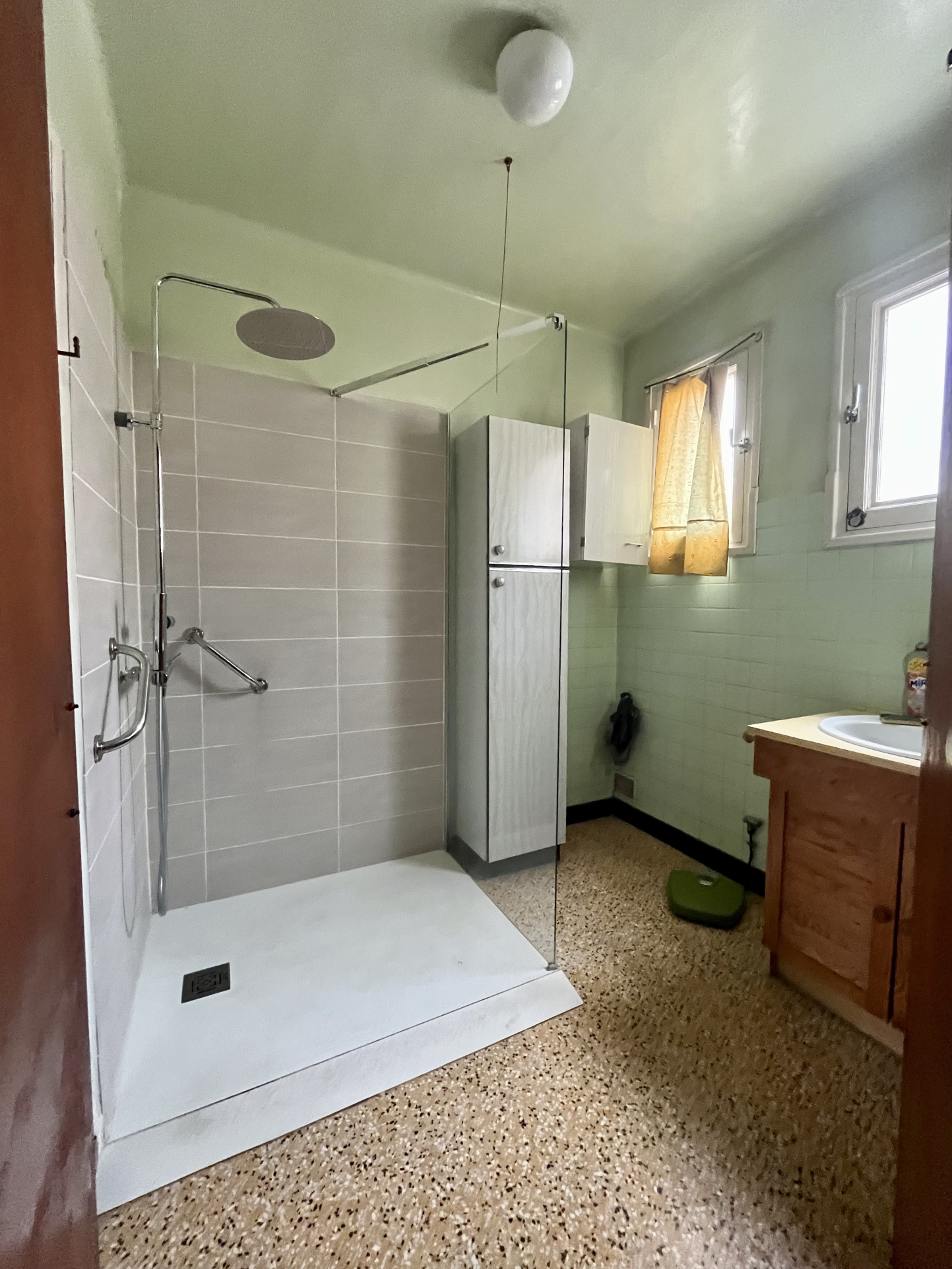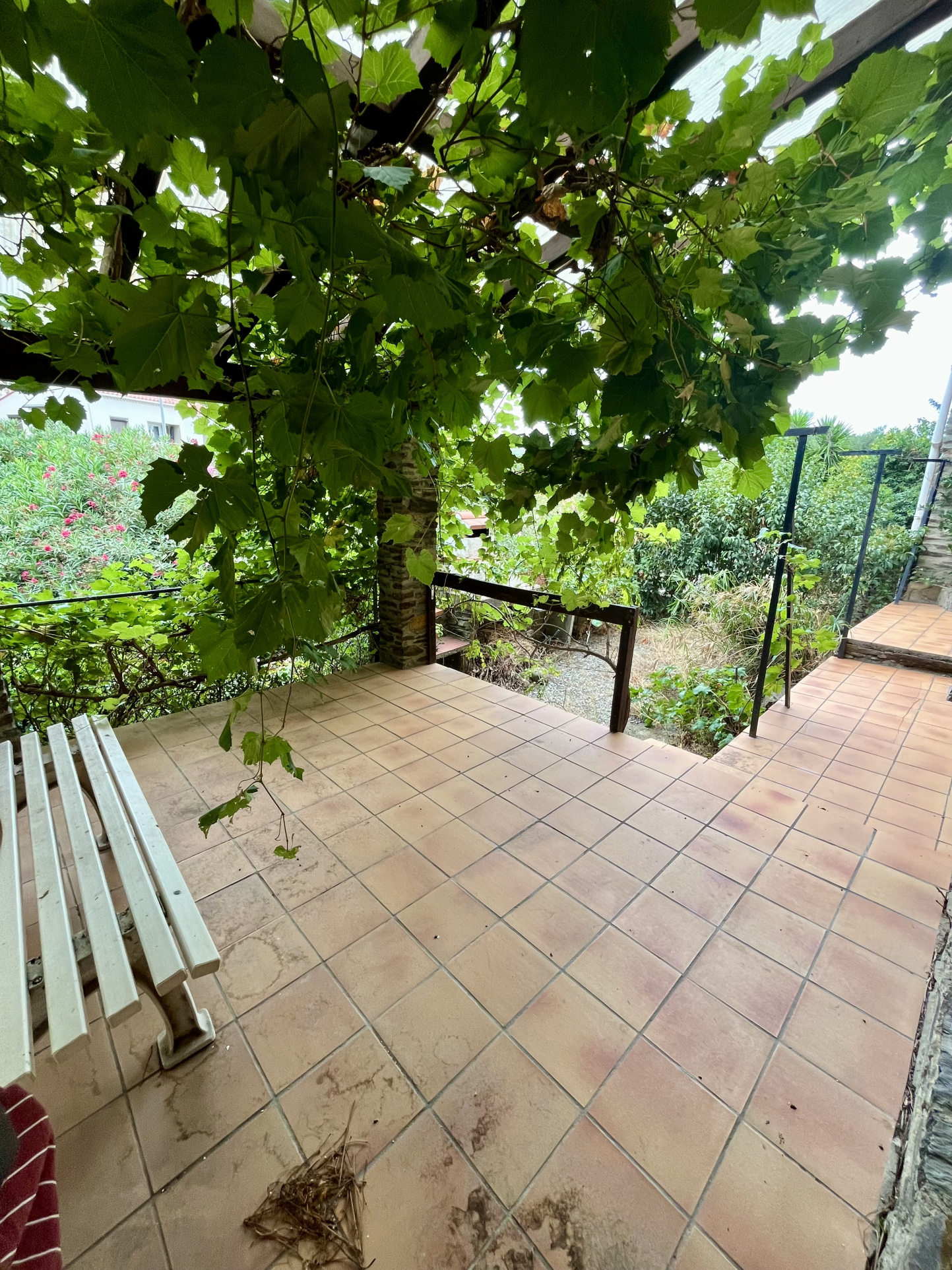 En dessous, 2 chambres avec balcon, une douche, une grande cuisine ouverte sur salon et une terrasse très agréable à l'ombre d'une vigne et jardinet.