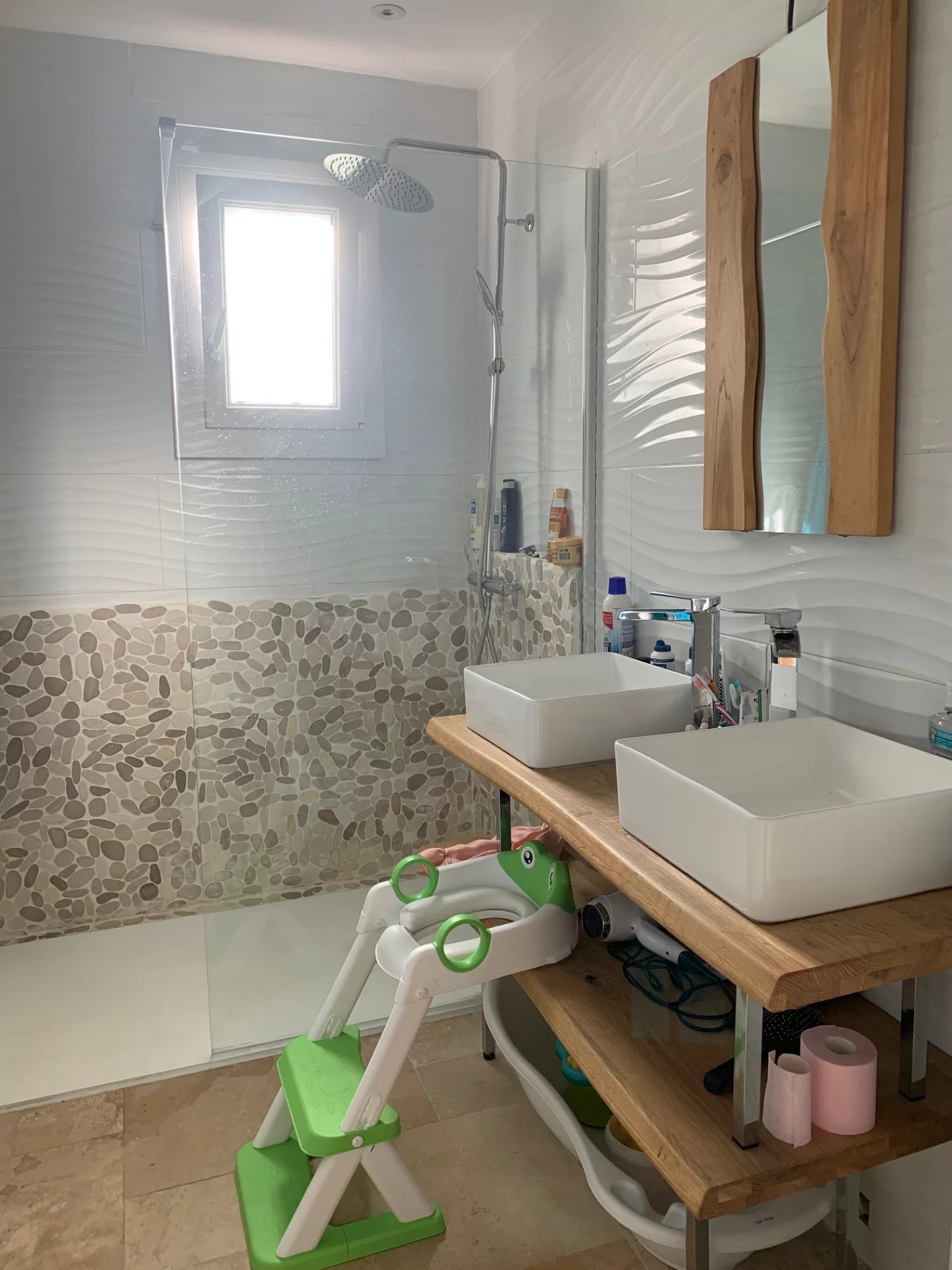 Elle se compose d'un séjour de 45m² ouvert sur une cuisine de 10m². Baies à galandage. Trois chambres, deux salles d'eau, 3 wc, de nombreux placards.