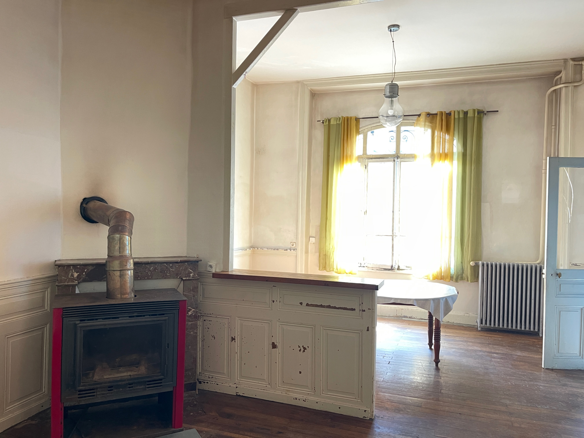 Auv 1162 : Grande maison, centre Pionsat, avec très beau jardin, 540m2 Ce magnifique bâtiment est en bon état général. Dans le passé, c'était un hôtel restaurant. La surface habitable actuelle est officiellement de 155m2, mais les combles peuvent encore être entièrement aménagés. Le jardin se trouve de l'autre côté de la petite rue sans issue à l'arrière, un beau jardin plat avec un joli abri de jardin et une allée pavée au milieu, entouré de divers arbres. Jusqu'à présent, il a été utilisé comme potager. Il est situé en plein centre de Pionsat, tout en étant dans un calme absolu. Charmant ! La maison comprend 2 étages et un grenier immense encore à aménager. Bien sûr, l'ensemble doit être modernisé. Cependant, il y a déjà un chauffage central au fioul avec des radiateurs dans toutes les pièces. À l'avant, au premier étage, se trouve un balcon d'origine. Les fenêtres et portes ont été en grande partie remplacées par du PVC à double vitrage. Voici les dimensions des pièces : Rez-de-chaussée : Entrée : 8,050m2 Hall : 9,560m2 Couloir : 4,720m2 Pièce : 9,860m2 Cuisine no1 : 9,740m2 Cuisine no2 : 10,192m2 WC : 2,060m2 Salon : 28,79m2 Premier étage : Palier : 6,120m2 Salle de bains : 5,010m2 Chambre no1 : 17,100m2 Bureau : 7,630m2 Chambre no2 : 8,880m2 Dressing : 4,380m2 Chambre no3 : 10,150m2 Chambre no4 : 13,480m2 TOTAL : 155,302m2