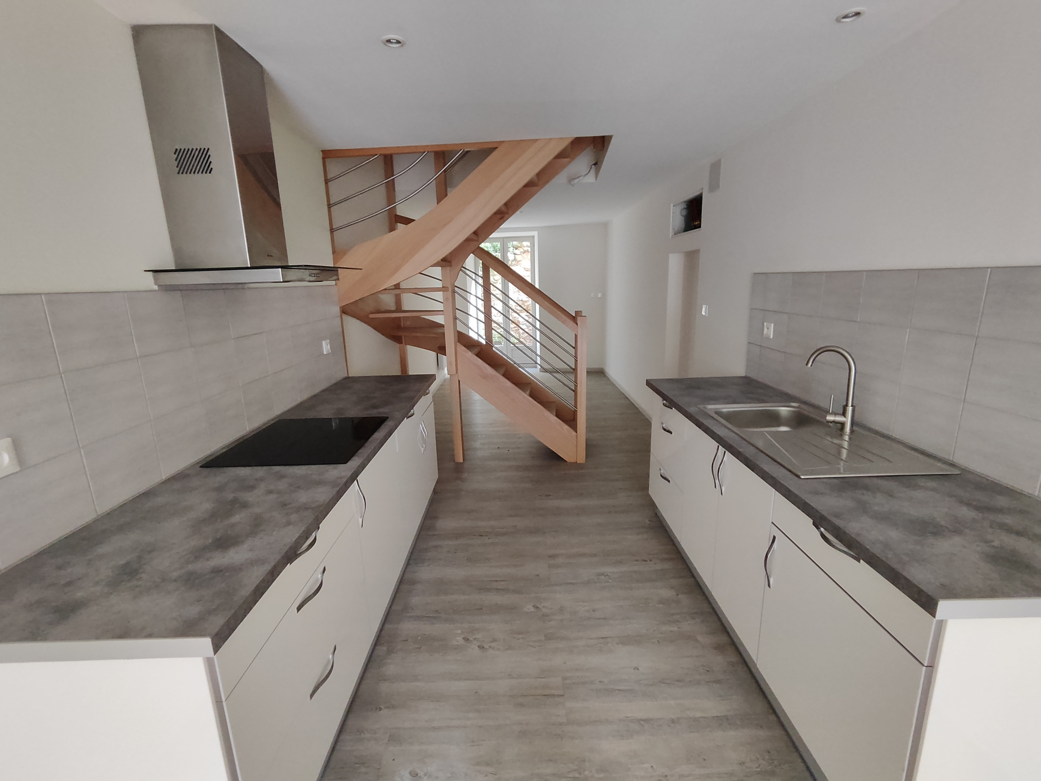 Maison de village rénovée de 76m2 avec 3 chambres, salon, cuisine, salle d'eau et une cour.