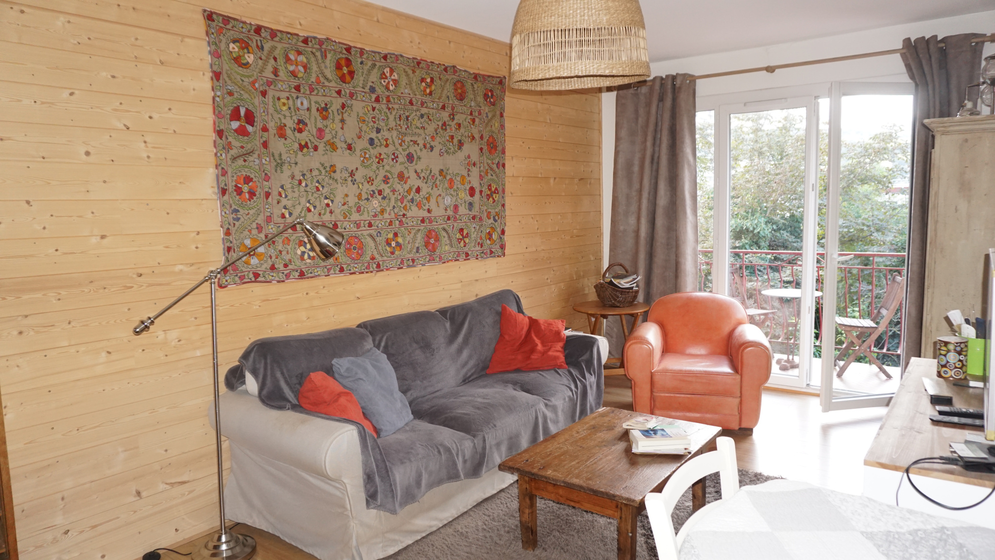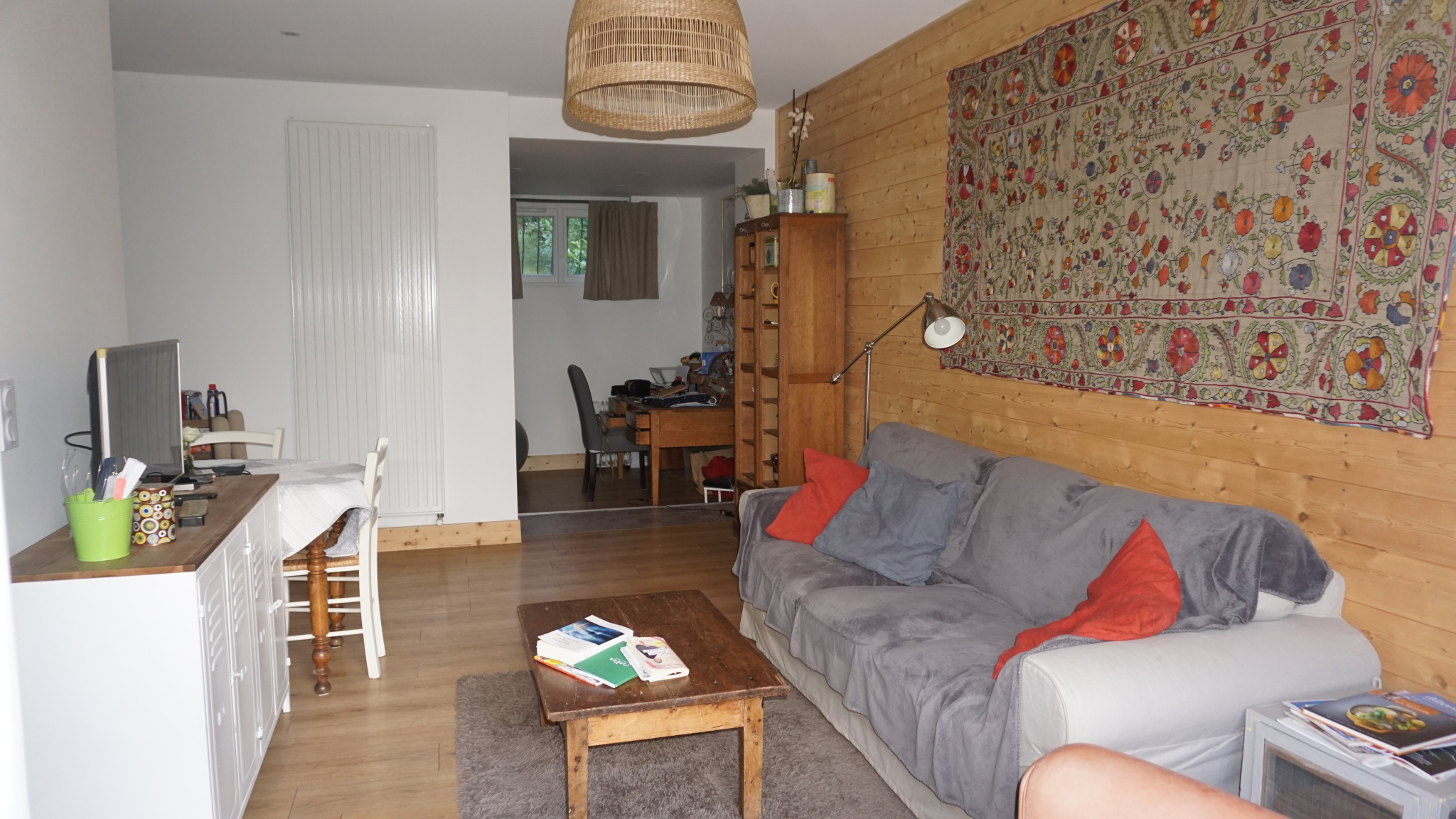 Un espace, dans la pièce de vie, est consacré à un bureau.