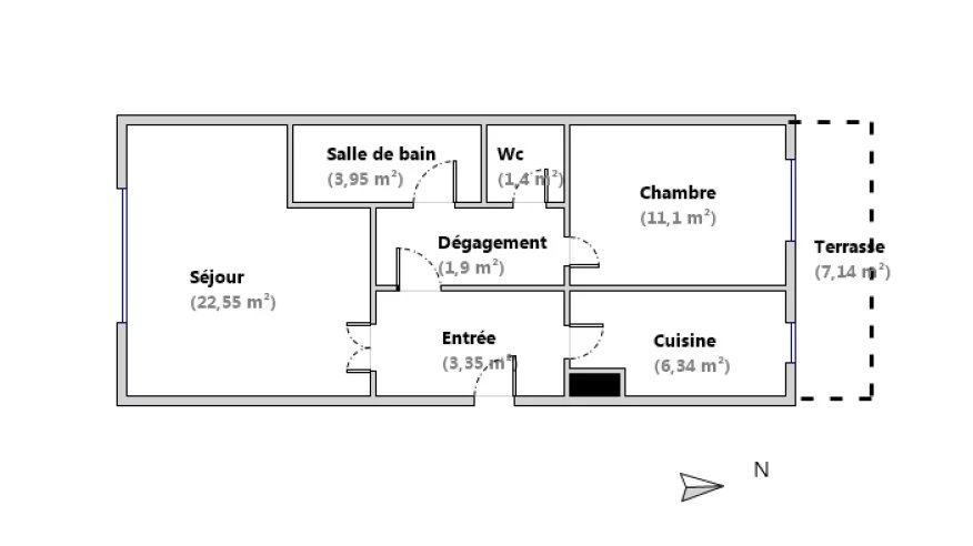 Il dispose d'une belle entrée, un grand séjour lumineux de 22.55m², d'une cuisine aménagée, d'une chambre de 11 M2, d'un WC indépendant et d'une salle de bain.