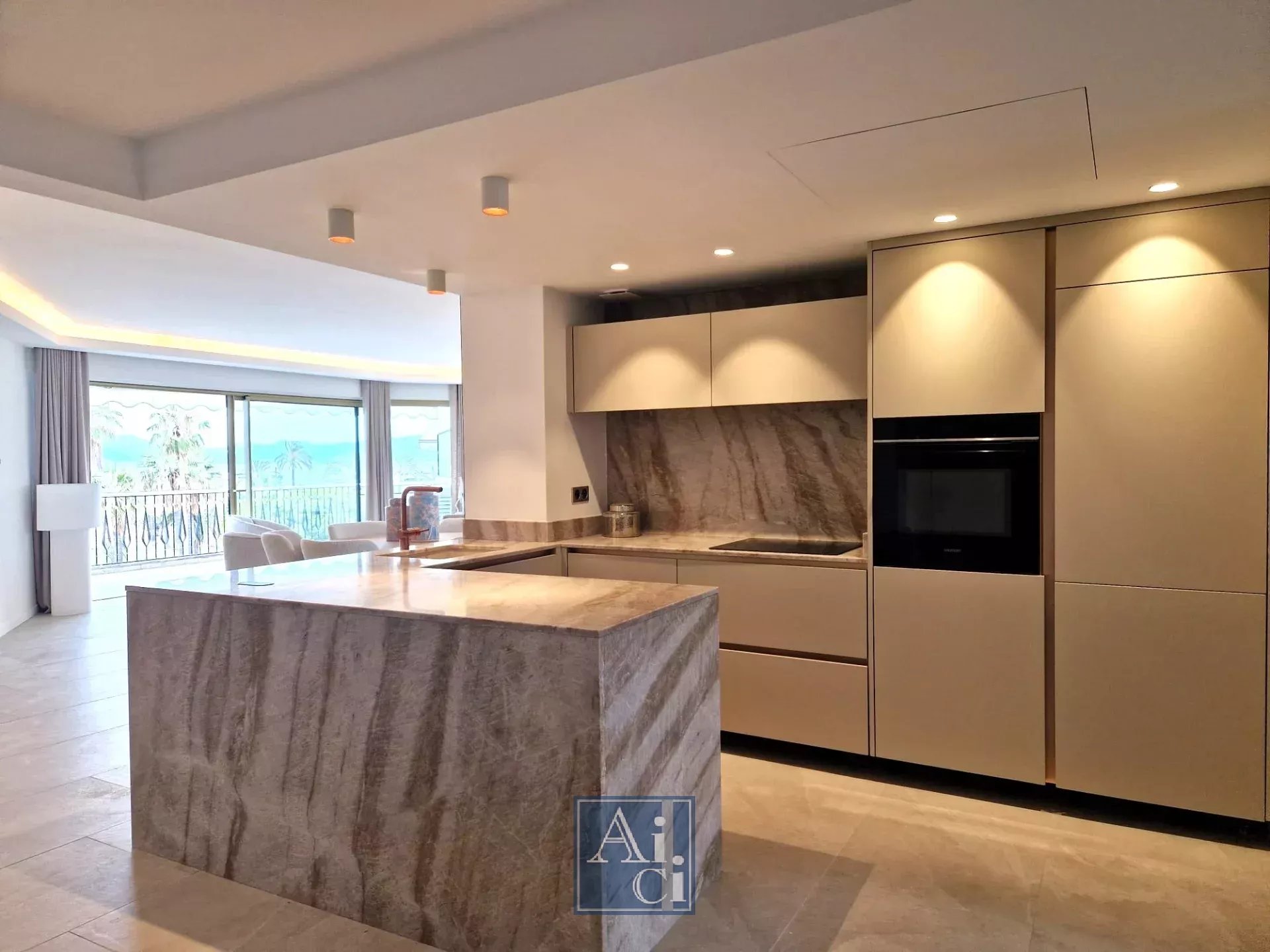 À vendre : Situé dans une résidence de luxe sécurisée 24h/24 sur la Croisette, à proximité des plages et en face du port Canto / Palm Beach, superbe appartement de 4 pièces entièrement rénové avec des prestations haut de gamme, d’une superficie de 95 m², ouvrant sur une terrasse de 12 m² exposée sud-ouest et offrant une vue dégagée sur la mer, la palmeraie et le massif de l’Esterel.