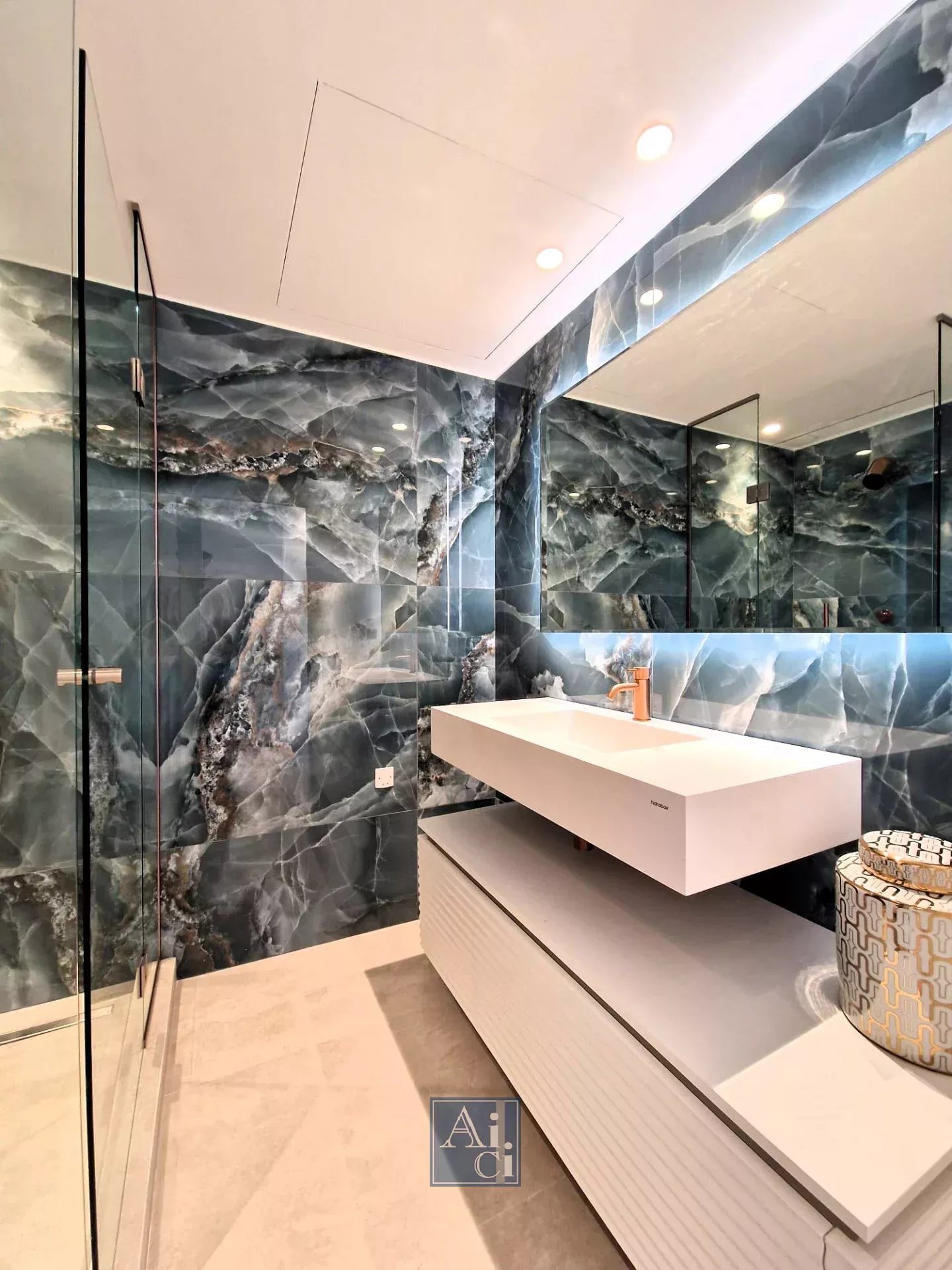 Il se compose d’une entrée, d’un séjour avec cuisine ouverte entièrement équipée, de trois chambres en suite, chacune avec sa salle de douche et son dressing.