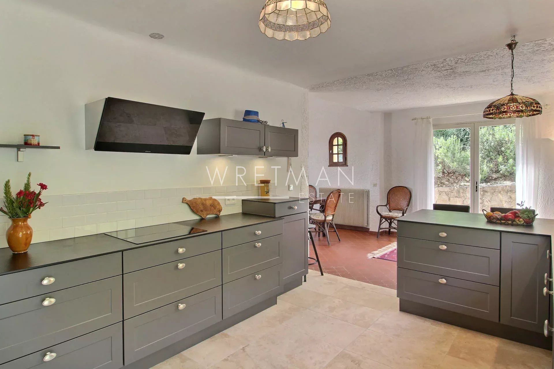 La villa vous offre un lumineux séjour avec belle hauteur sous plafond cheminée et espace salle à manger s'ouvrant sur une terrasse avec vue, une vaste cuisine équipée ouverte sur le séjour, ainsi que deux chambres et une salle de bain.