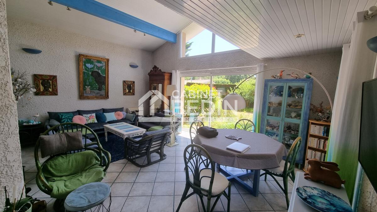 SANGUINET. Cette belle maison familiale offre de multiples possibilités : location saisonnière ou chambre d'hôtes. Idéalement située à environ 300 mètres du lac, elle bénéficie d'un salon/séjour lumineux exposé sud-ouest, ouvrant sur une terrasse couverte. Une mezzanine spacieuse, une cuisine avec terrasse privée, trois chambres dont deux avec salle d'eau et WC, un bureau, un atelier avec salle d'eau attenante, un dressing et de nombreux rangements complètent ce bien. Le terrain d'environ 790 m² accueille un abri de jardin et un carport. À visiter sans tarder. . Les informations sur les risques auxquels ce bien est exposé sont disponibles sur le site Géorisques : www. georisques. gouv. fr. Montant estimé des dépenses annuelles d?énergie pour un usage standard : entre 1290 et 1820 Euros/an (année de référence 2023)