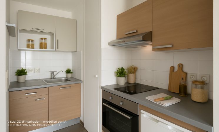 D'une superficie de 41,15 m² avec balcon de 9 m² il comprend une pièce de vie avec coin cuisine équipée, une chambre et une salle de bains avec WC.