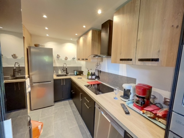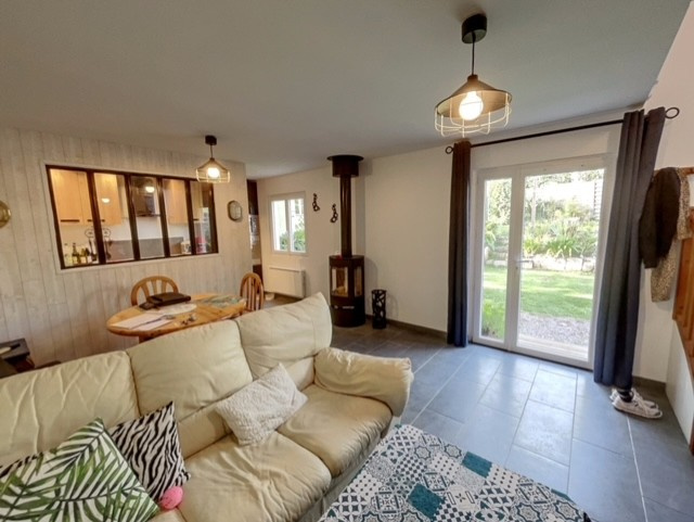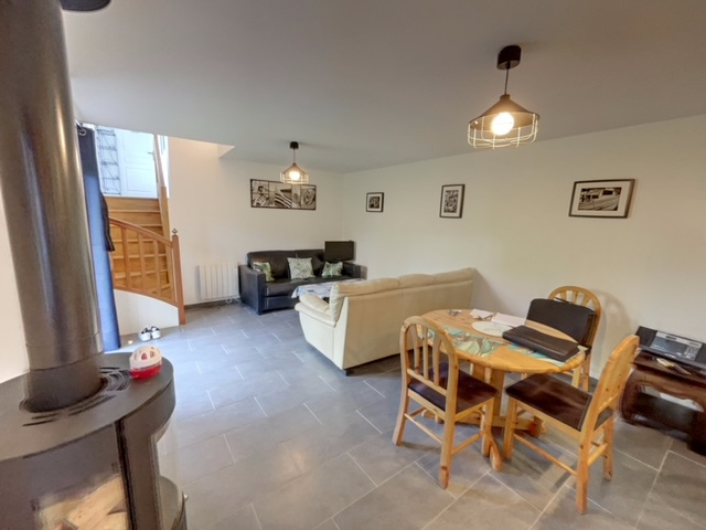 Au rez-de-chaussée: Séjour avec poêle à bois, cuisine équipée