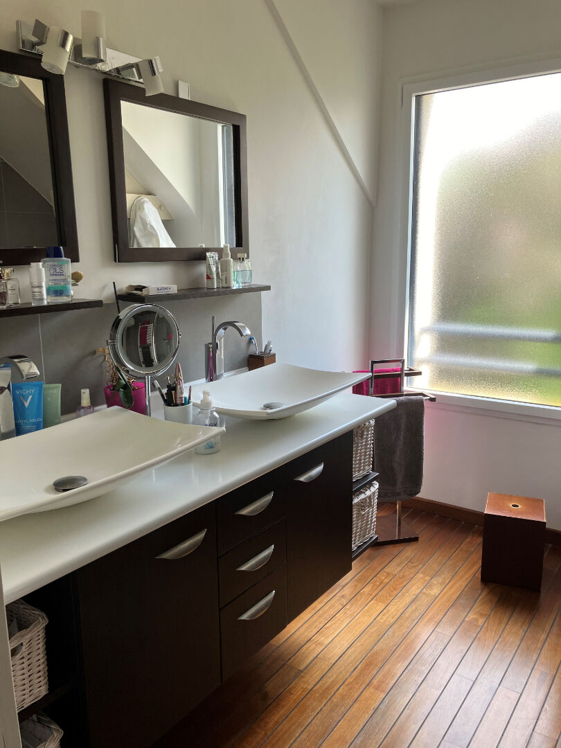 A l étage: un grand palier bureau, trois chambres, une suite parentale avec terrasse, dressing et salle d'eau avec wc privatif, une seconde pièce d'eau avec douche et baignoire, wc.