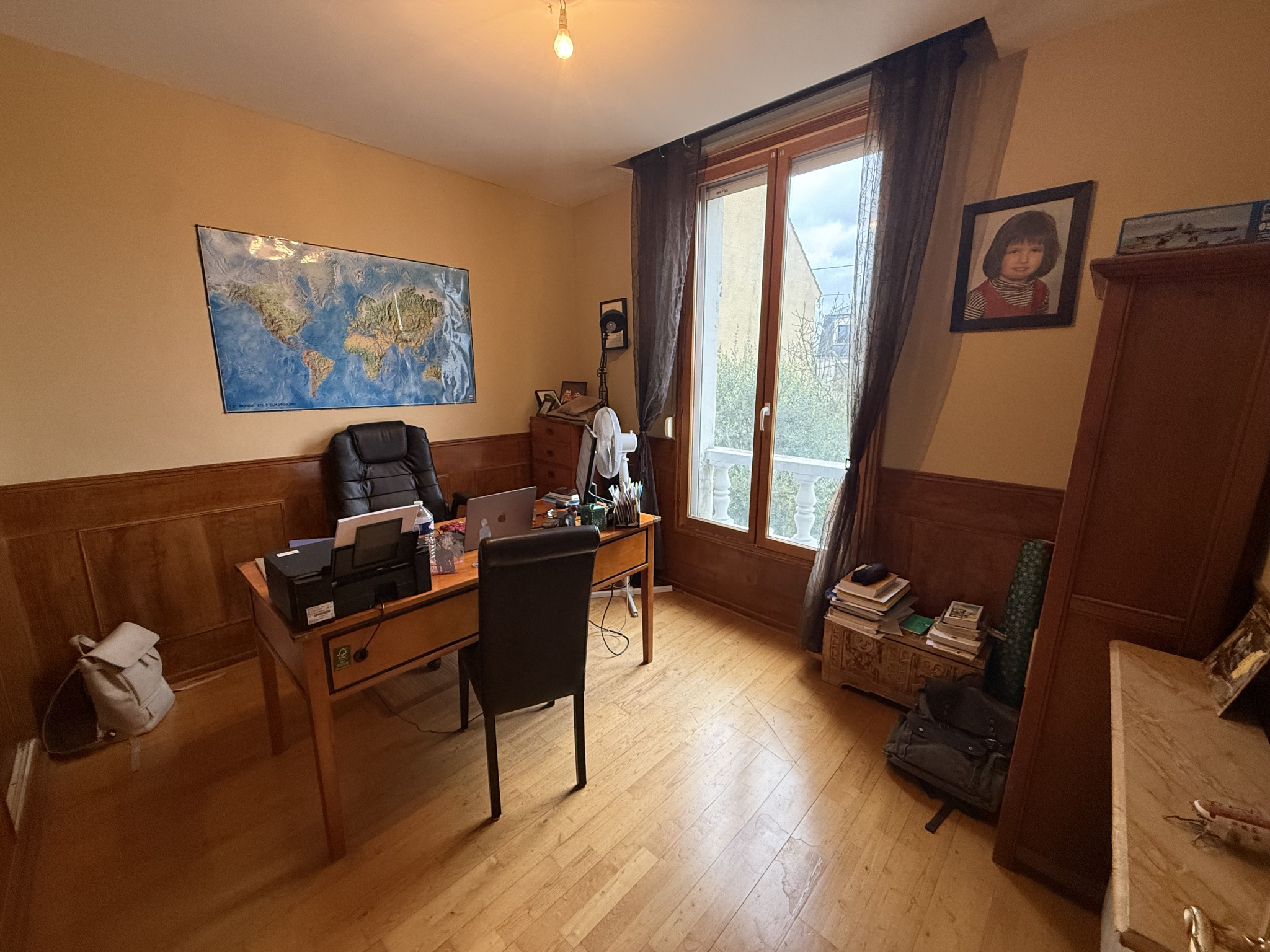 A l'étage : 3 chambres, une bibliothèque donnant sur une chambre en mezzanine, une salle de bains, un wc.