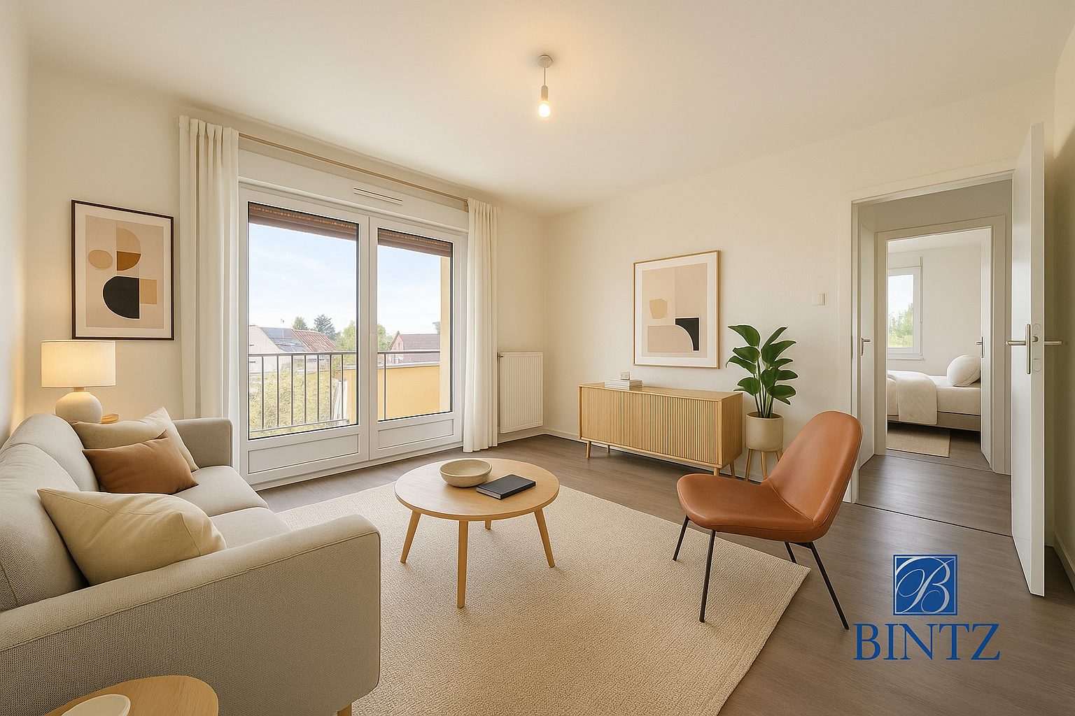 Le salon lumineux s'ouvre sur un balcon d'environ 2 m², offrant un coin extérieur pour se détendre et profiter de l'air frais.
