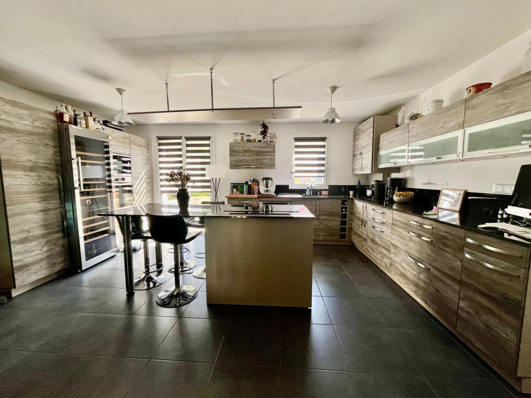 En rez-de-chaussée : une belle entrée, une grande cuisine moderne équipée avec accès direct à une 1ère terrasse, une salle à manger lumineuse, un cellier / buanderie et une suite parentale composée d'une vaste chambre avec espace bureau, dressing et salle d'eau avec WC.