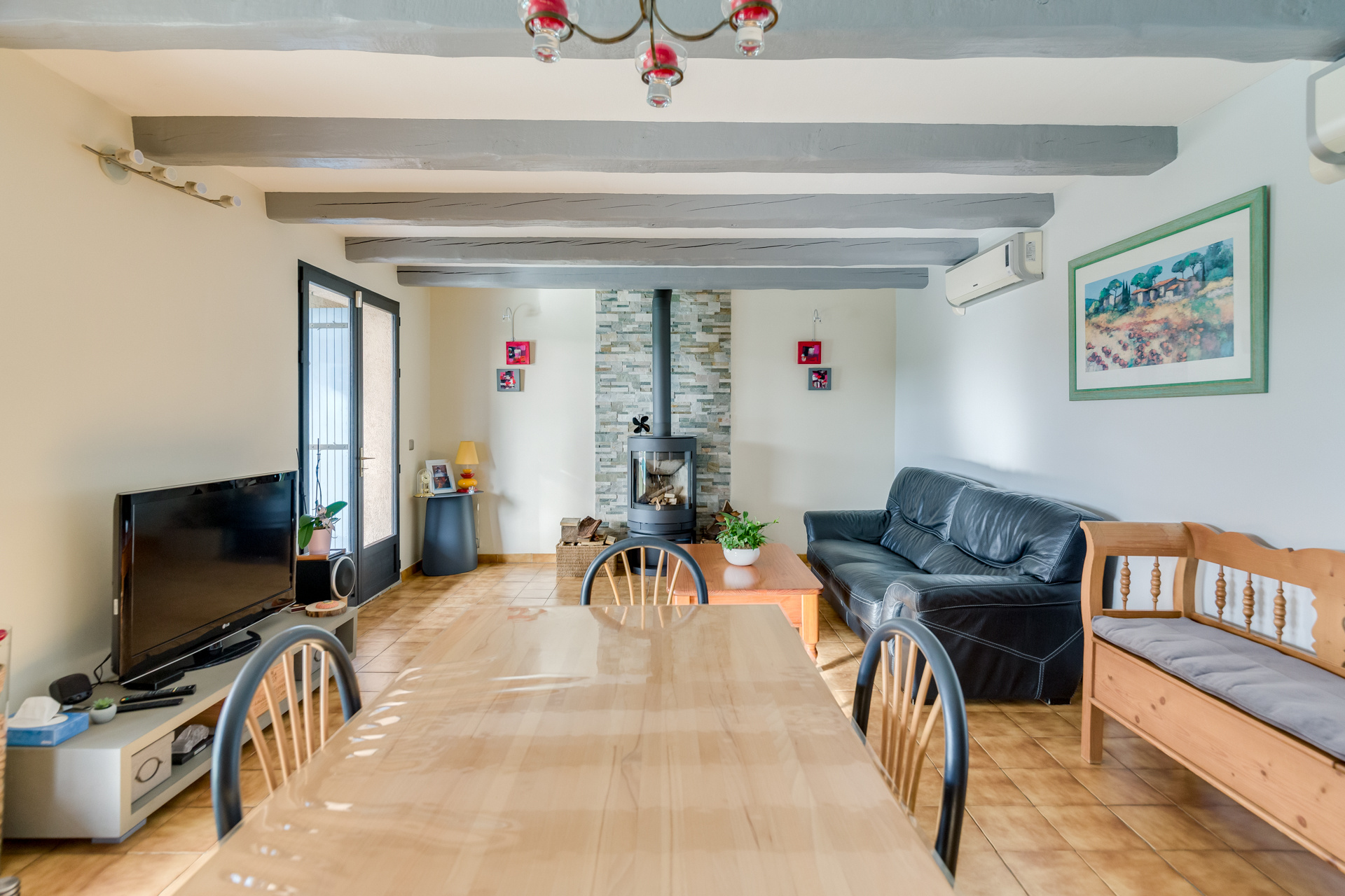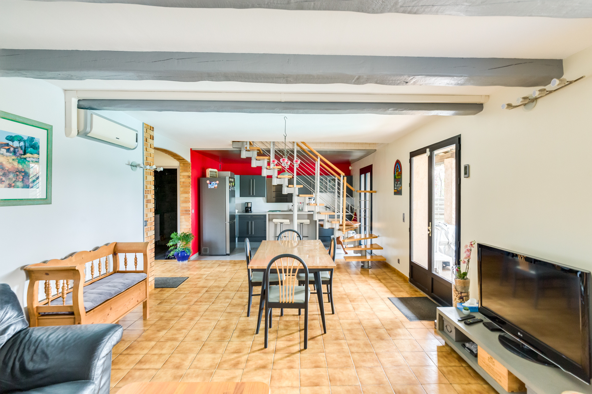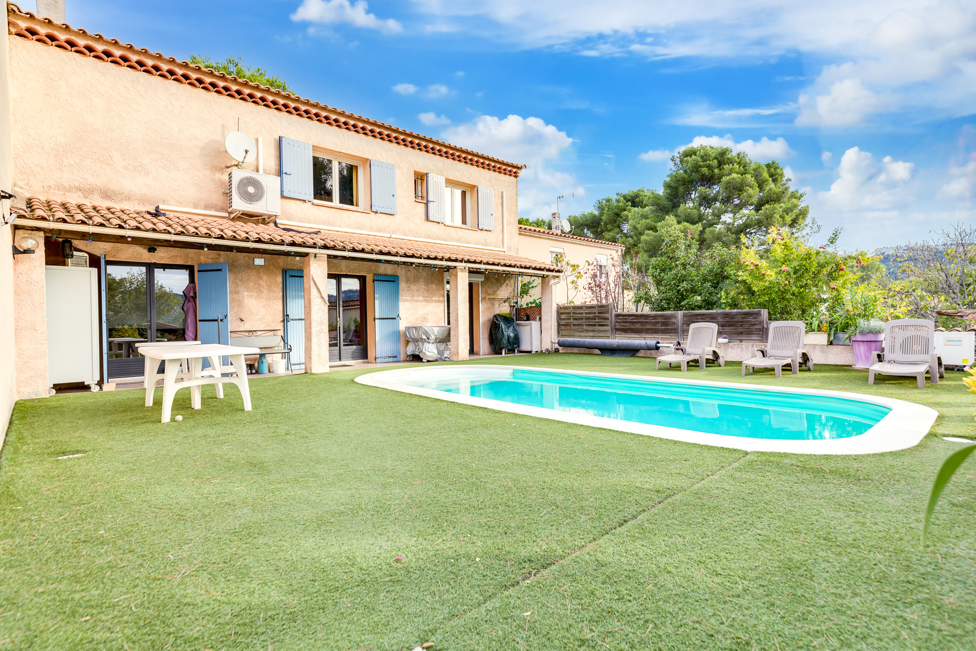 Cassis - Au calme, dans clos privé à l'entrée du village, villa de type 5 climatisée édifiée sur un terrain arboré plat et clos de 422 m2 avec piscine. Elle se compose, en rez-de-jardin, d'un hall d'entrée, un vaste salon / salle à manger et cuisine ouverte équipée de près de 45 m2, une buanderie, un cellier et une salle d'eau avec wc. A l'étage, quatre chambres, un dressing et une salle de bains avec wc. Environnement agréable et verdoyant. On trouve également un chalet en bois de 19 m2 aménagé en dépendance et un abri pour un véhicule. Terrasse au Sud et vue dégagée.