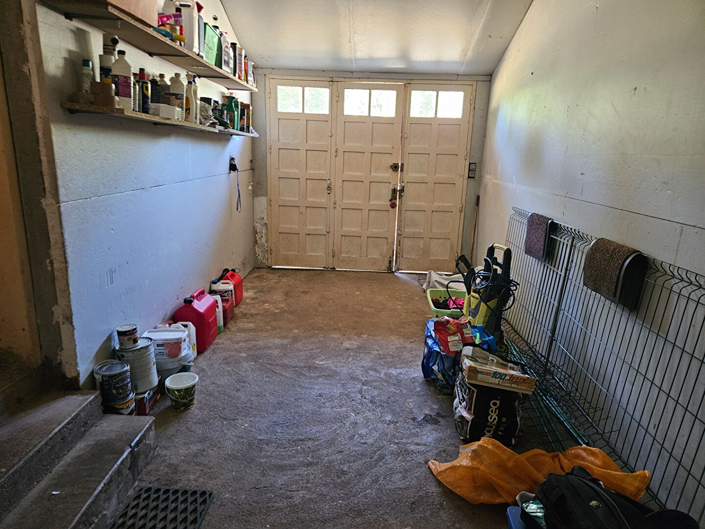 Garage et atelier. Jardin autour avec abri de jardin.