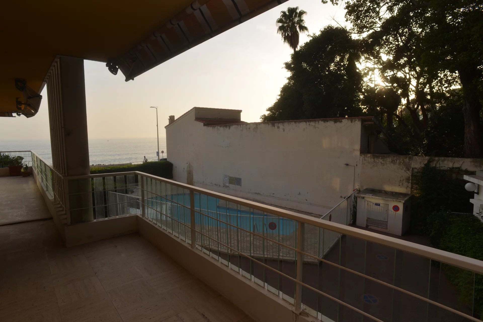 Appartement deux piéces à rénover au 1ér étage (avec ascenseur), grande terrasse d'angle avec vue mer laterale dans une résidence avec piscine et plage au pied de l'immeuble. Parking collectif.