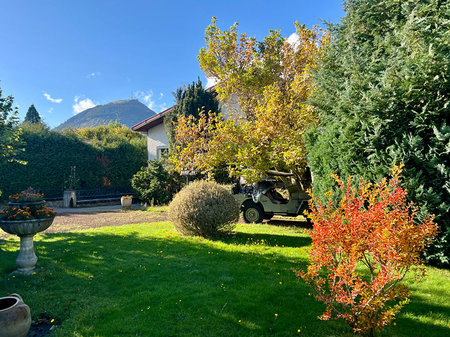 - Jardin calme et plat autour de la maison, clôturé avec vue sur le Puy de Dôme et de grands arbres de caractères