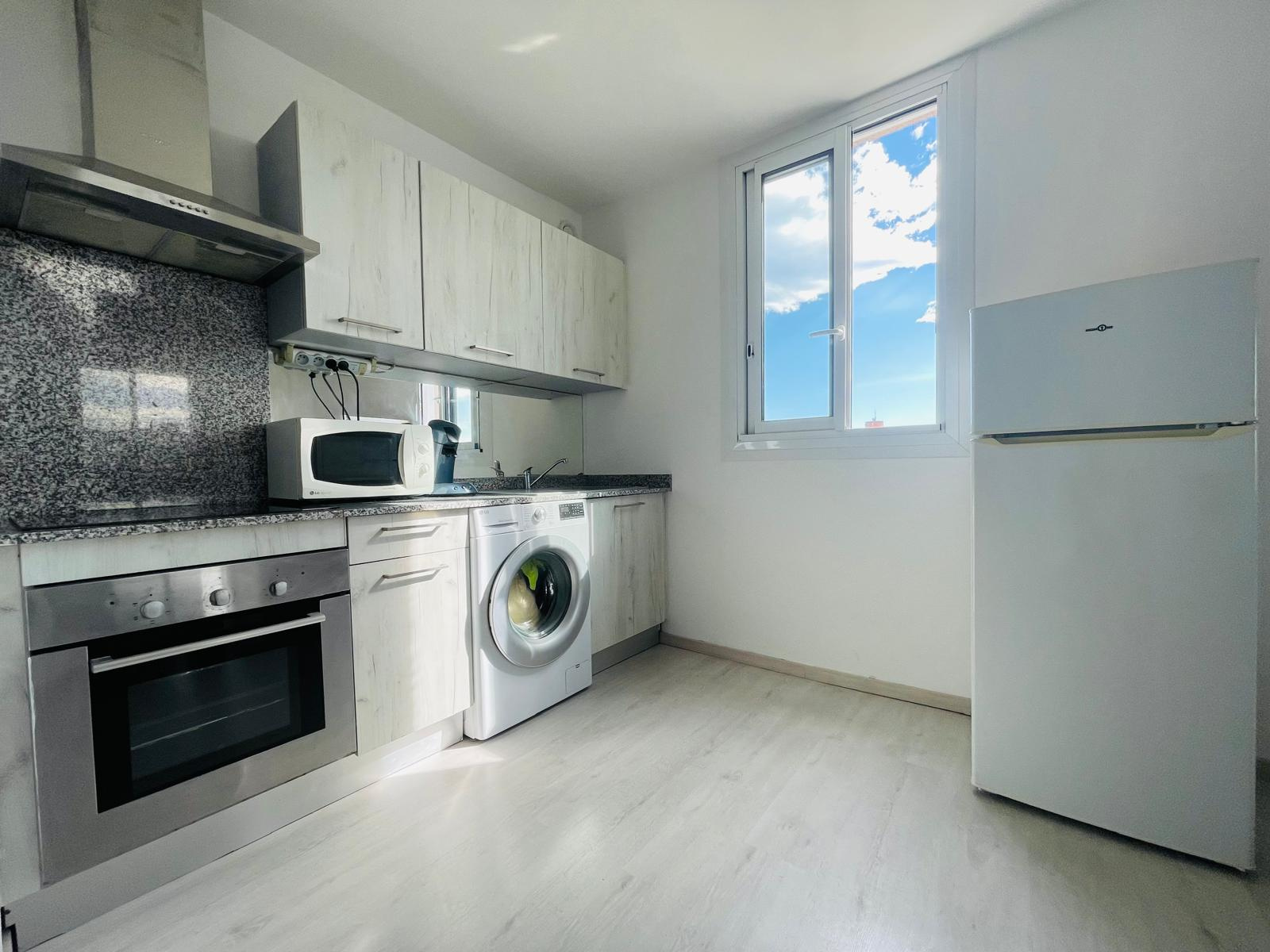 Cette appartement entièrement rénovée posséde une pièce de vie de plus de 26 m2 avec sa cuisine ouverte et le côté salon permet l'accès au balcon.