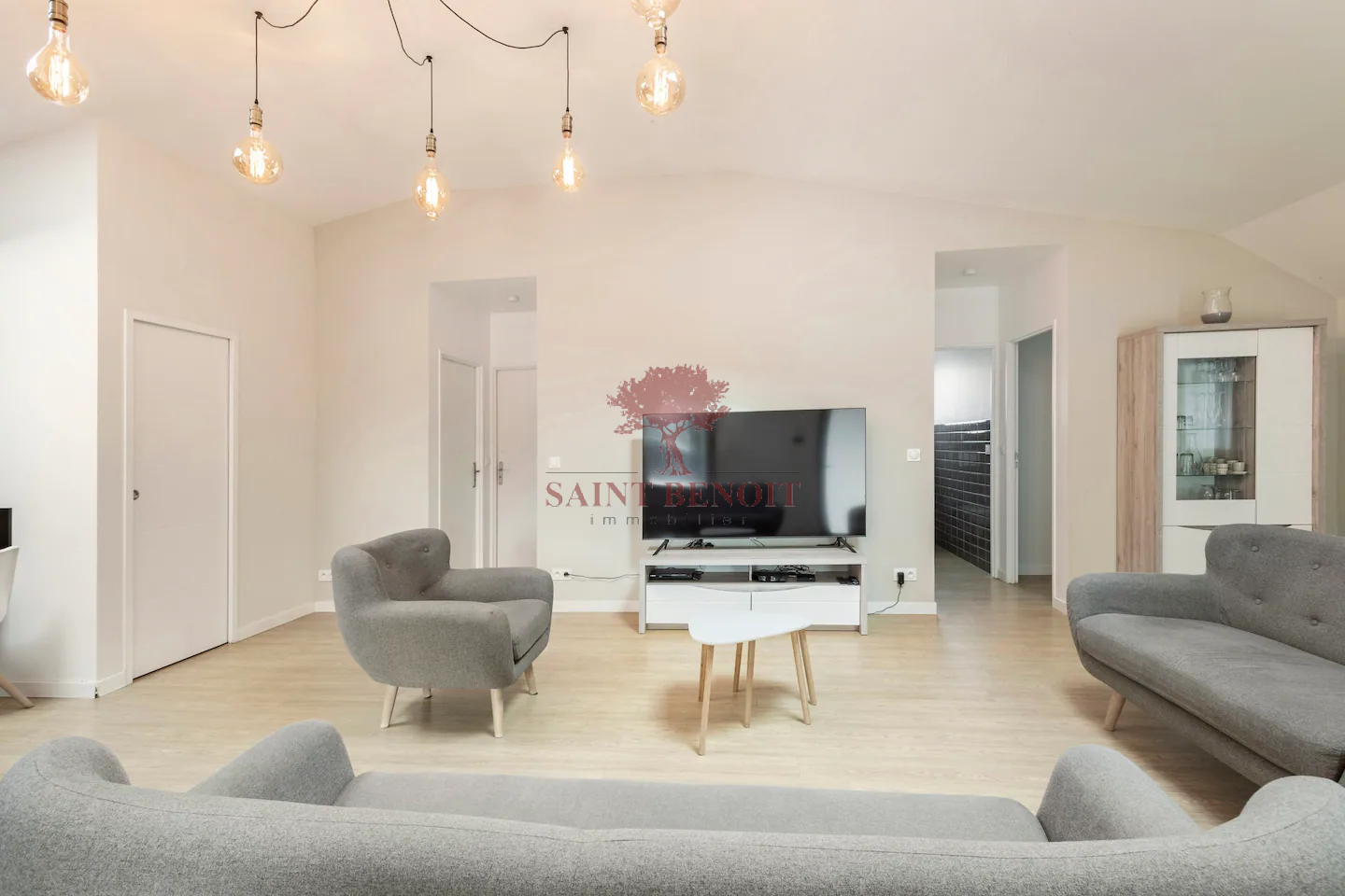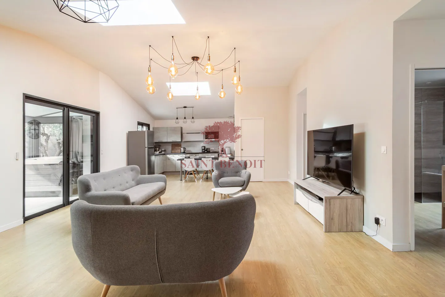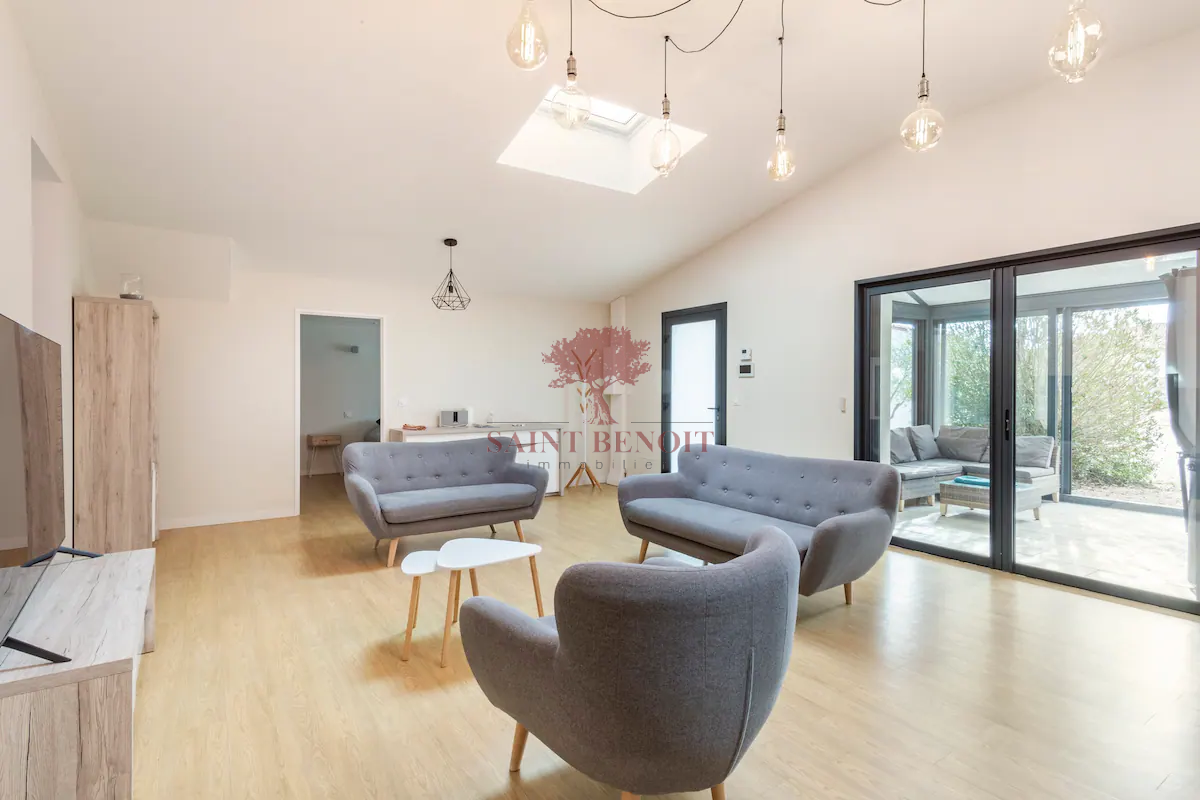 Une grande pièce à vivre avec cuisine ouverte et aménagée donnant sur une veranda de 20 m2, une chambre parentale, deux chambres avec placard, salle d'eau et deux WC.