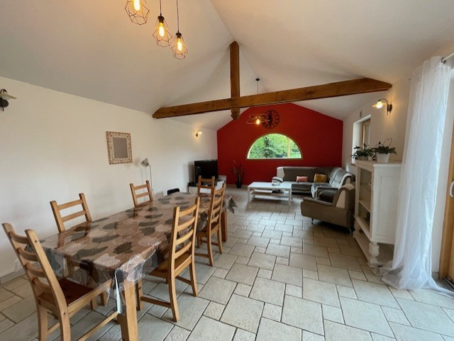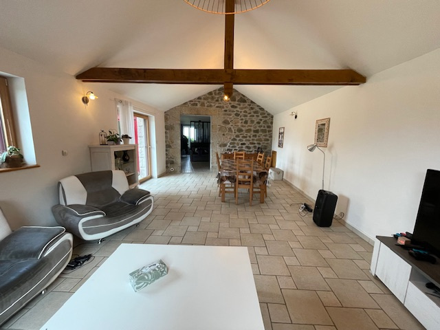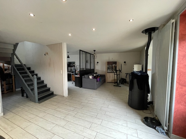 Au rez-de- chaussée: Entrée, séjour avec poêle à pellets, salle à manger, cuisine ouverte avec cheminée, arrière cuisine avec évier et douche, pièce de vie de 37m2, atelier, buanderie/chaufferie, water-closet.