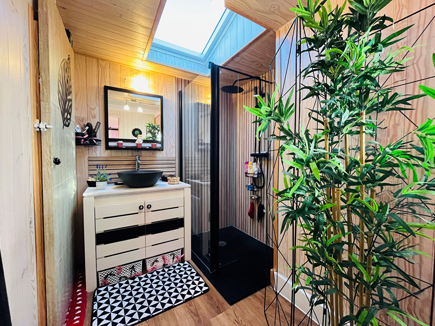 Au rez-de-chaussée : séjour avec cuisine ouverte aménagée et équipée, une salle d'eau avec WC et une buanderie.