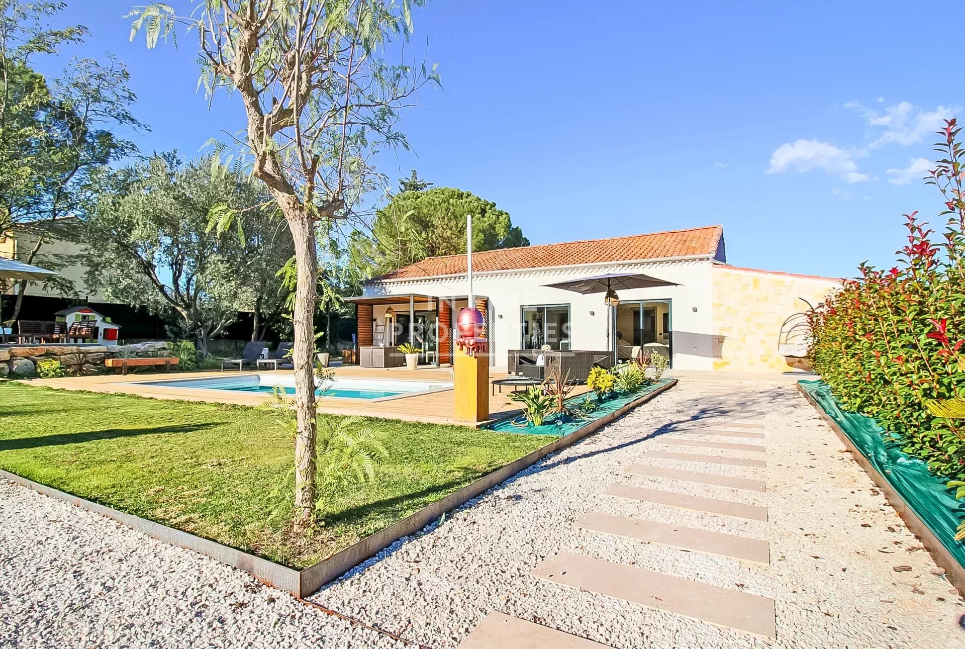 Villa moderne de plain pied de type 5 pièces comprenant 4 chambres d'une superficie habitable d'environ 150m2 édifiée sur un terrain plat de 1500 M2 avec piscine, abris de voitures et jeux de boule.