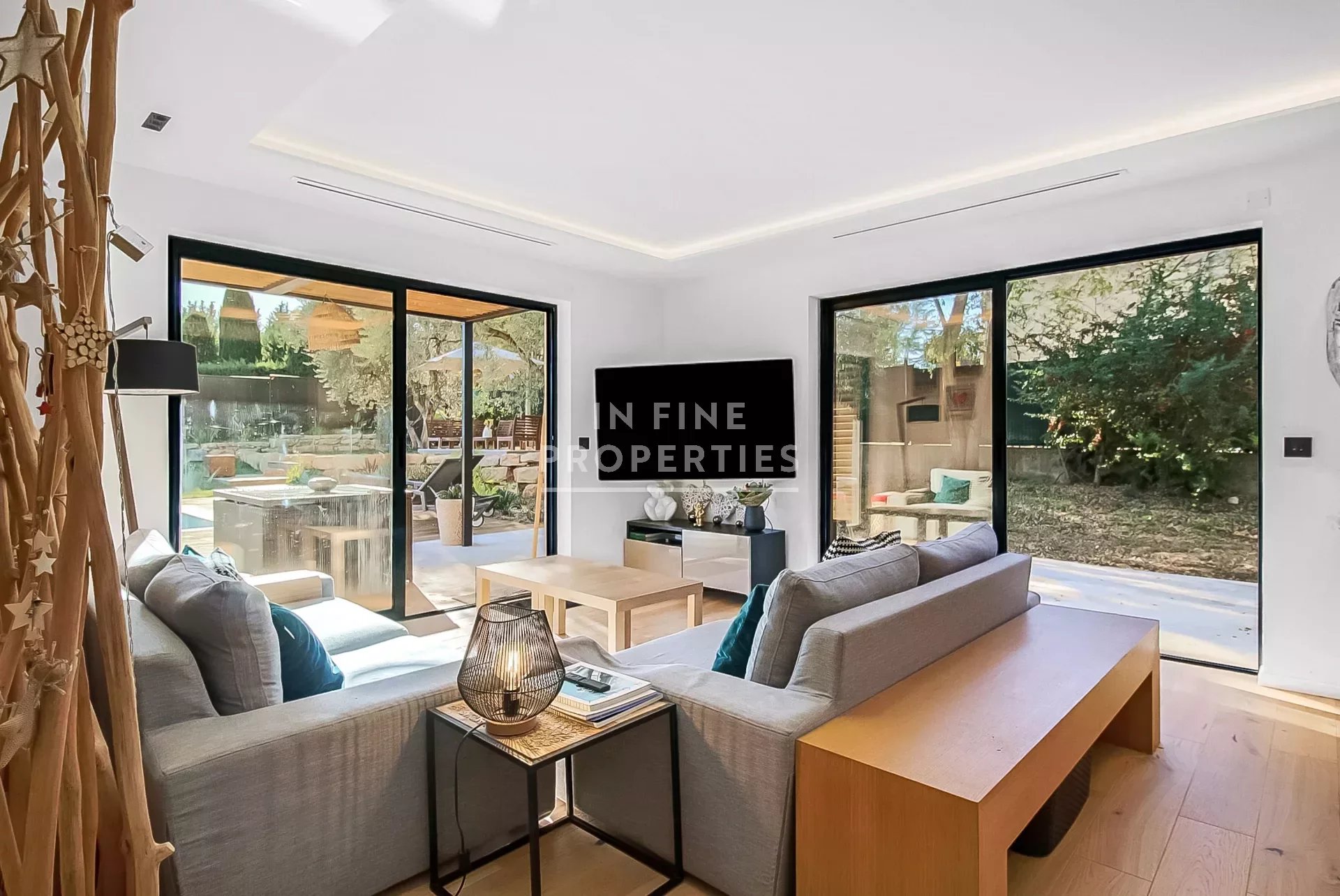 Vous trouverez un hall d’entrée donnant sur la pièce de vie avec salon, séjour et cuisine ouverte. Toutes ces pièces donnent sur le jardin et la piscine.
