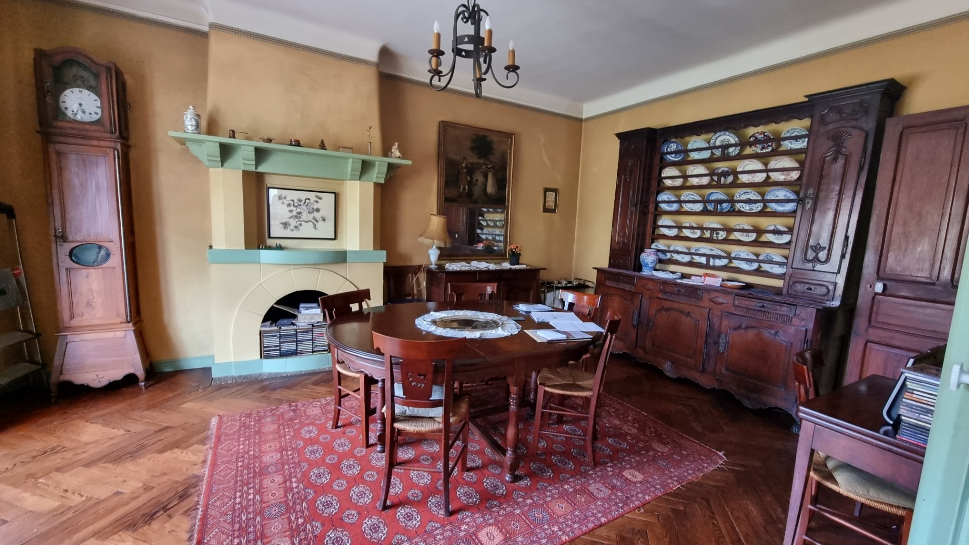 La maison est distribuée de la façon suivante : Entrée, bureau, salon - salle à manger avec cheminée, 8 chambres, deux salles d'eau, une salle de bains, trois wc.