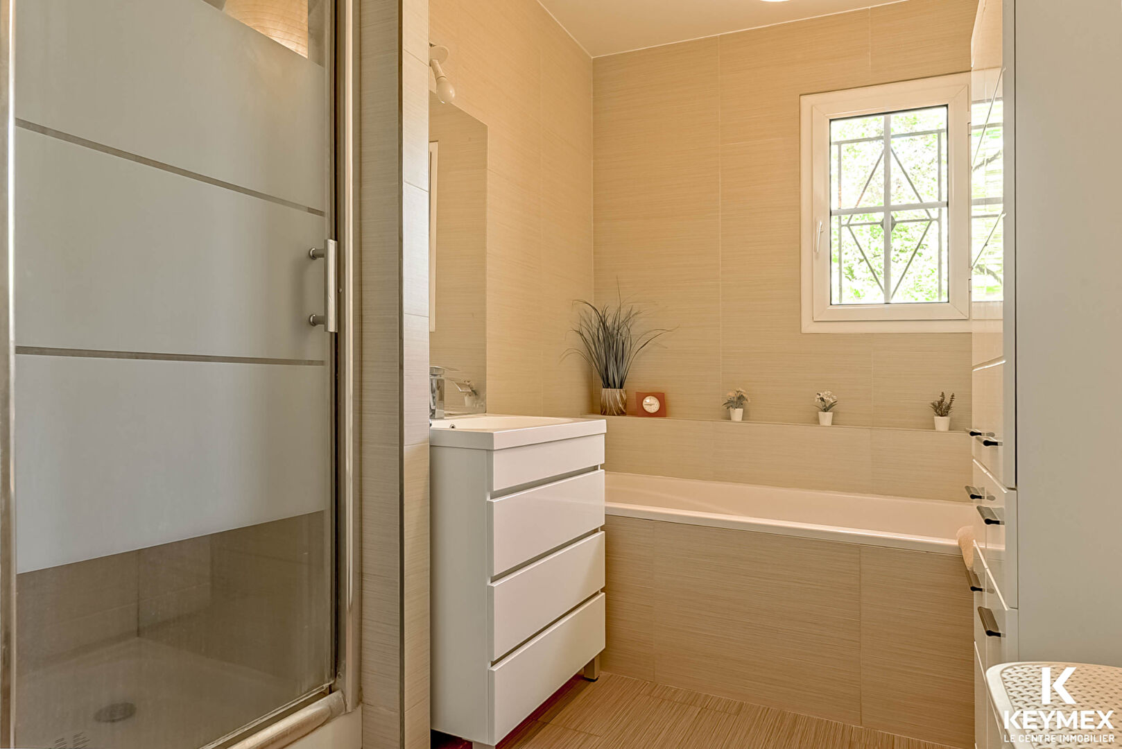 A l'étage : une spacieuse pièce palière dessert 3 chambres, une salle de bains avec douche et baignoire, un WC et un appartement de 45 m2 donnant également accès à l'extérieur.