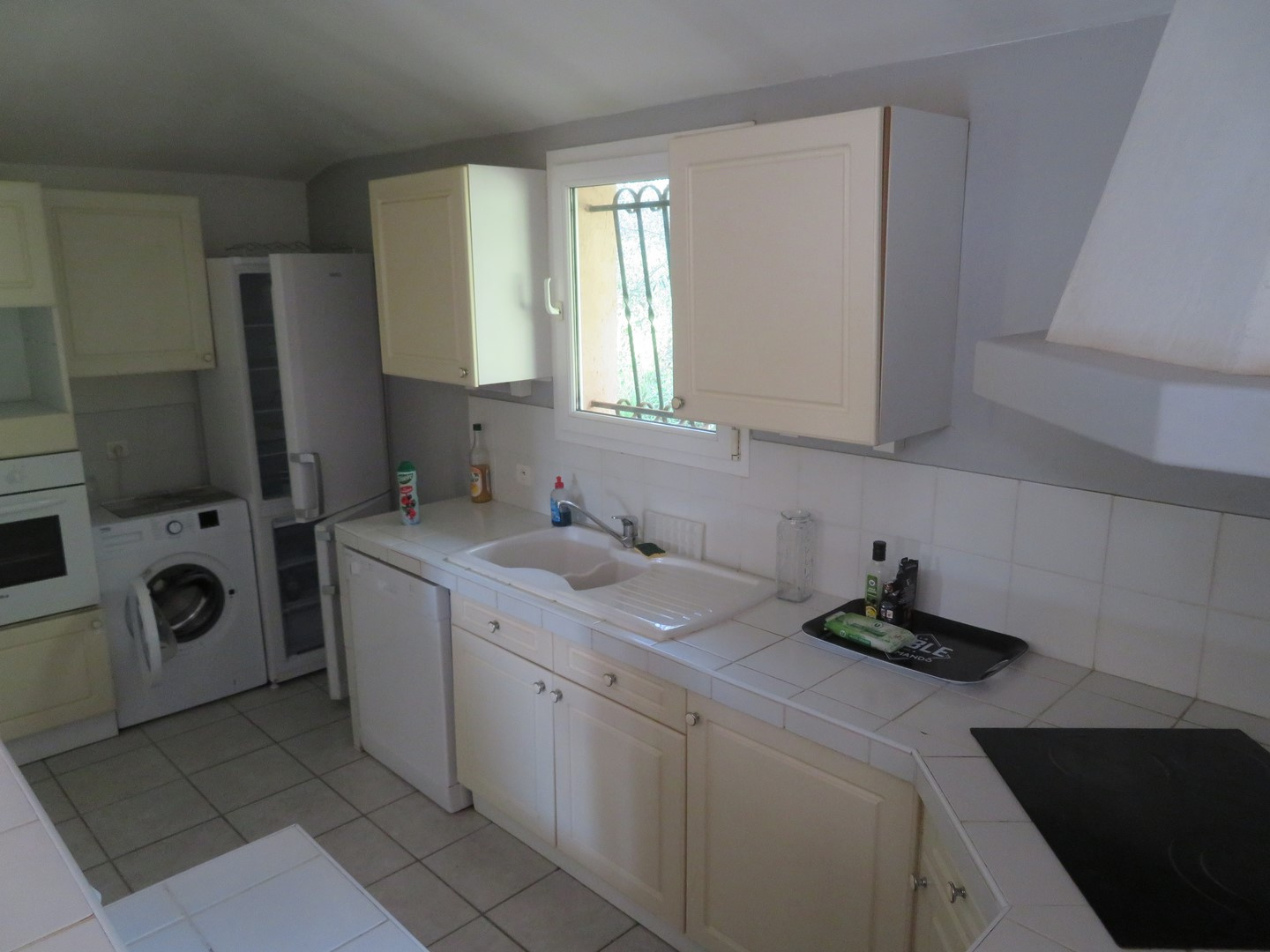 Un salon avec cheminée à foyer ouvert donnant sur une belle terrasse couverte de 14.77 m2, une cuisine ouverte, un WC, deux chambres, une salle d'eau, une suite parentale de 19.34 m2 avec salle d'eau.